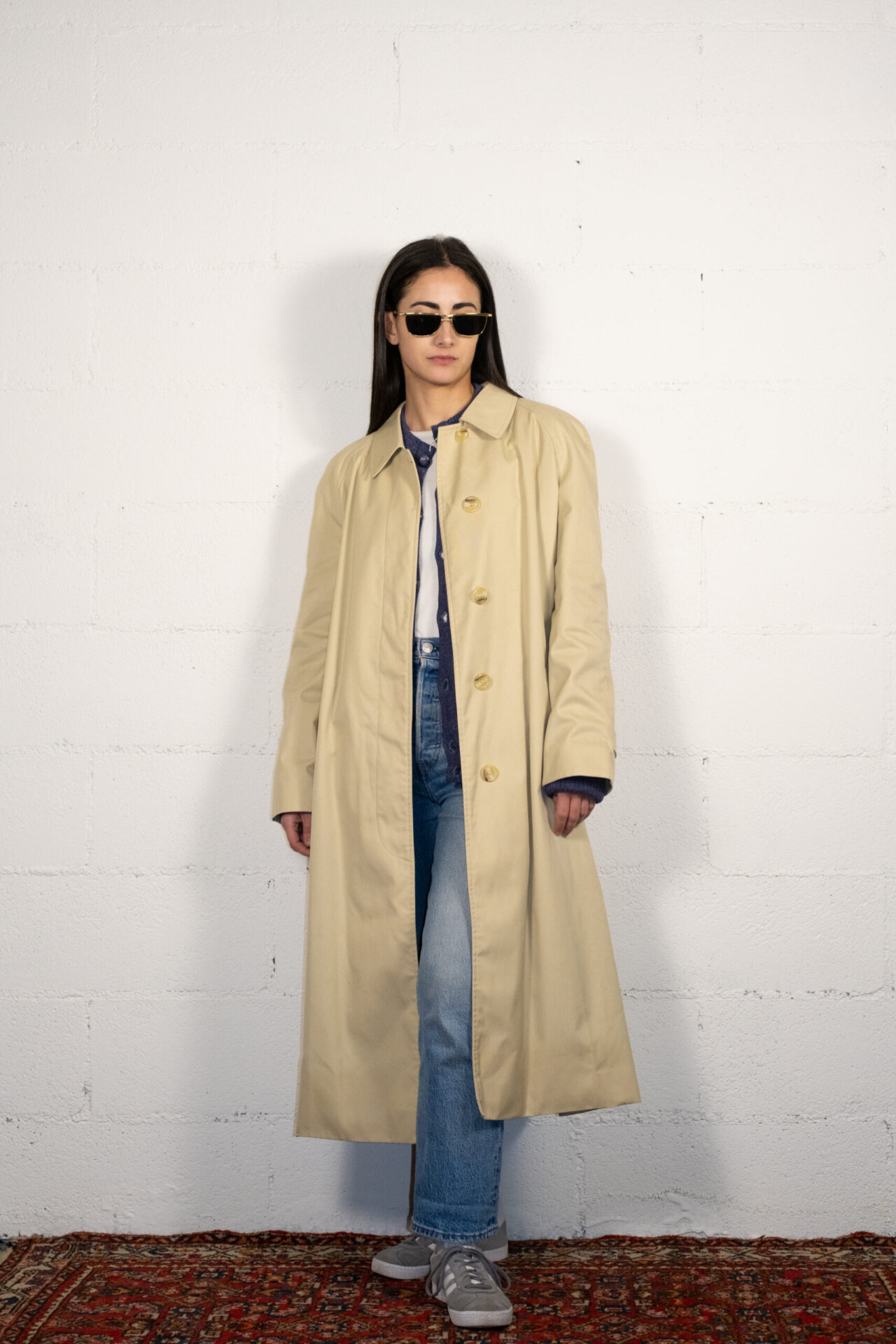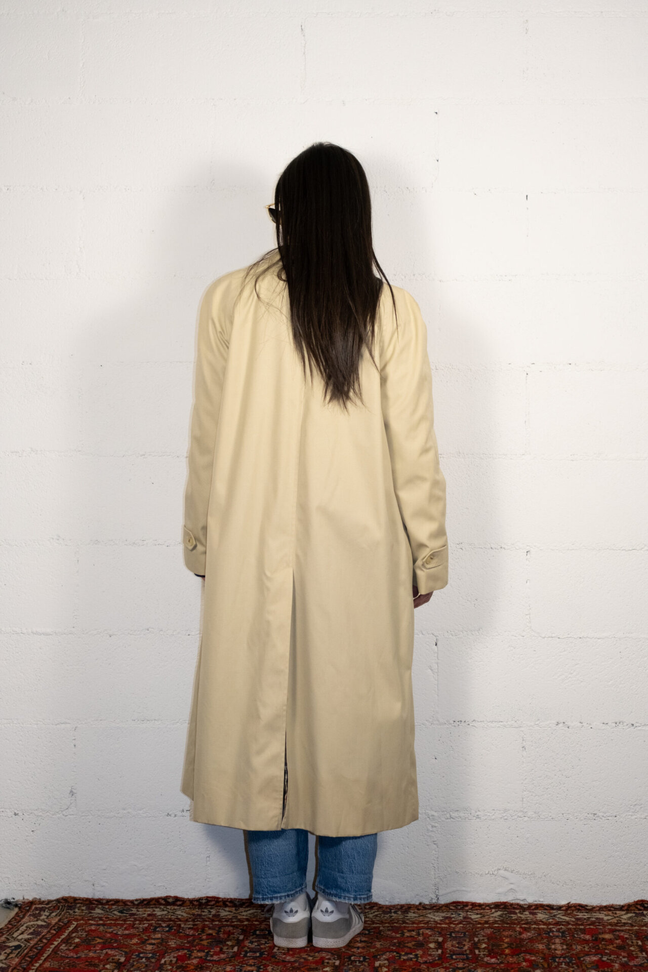 Burberry-like trench coat, features a straight cut and two side pockets. Excellent condition.