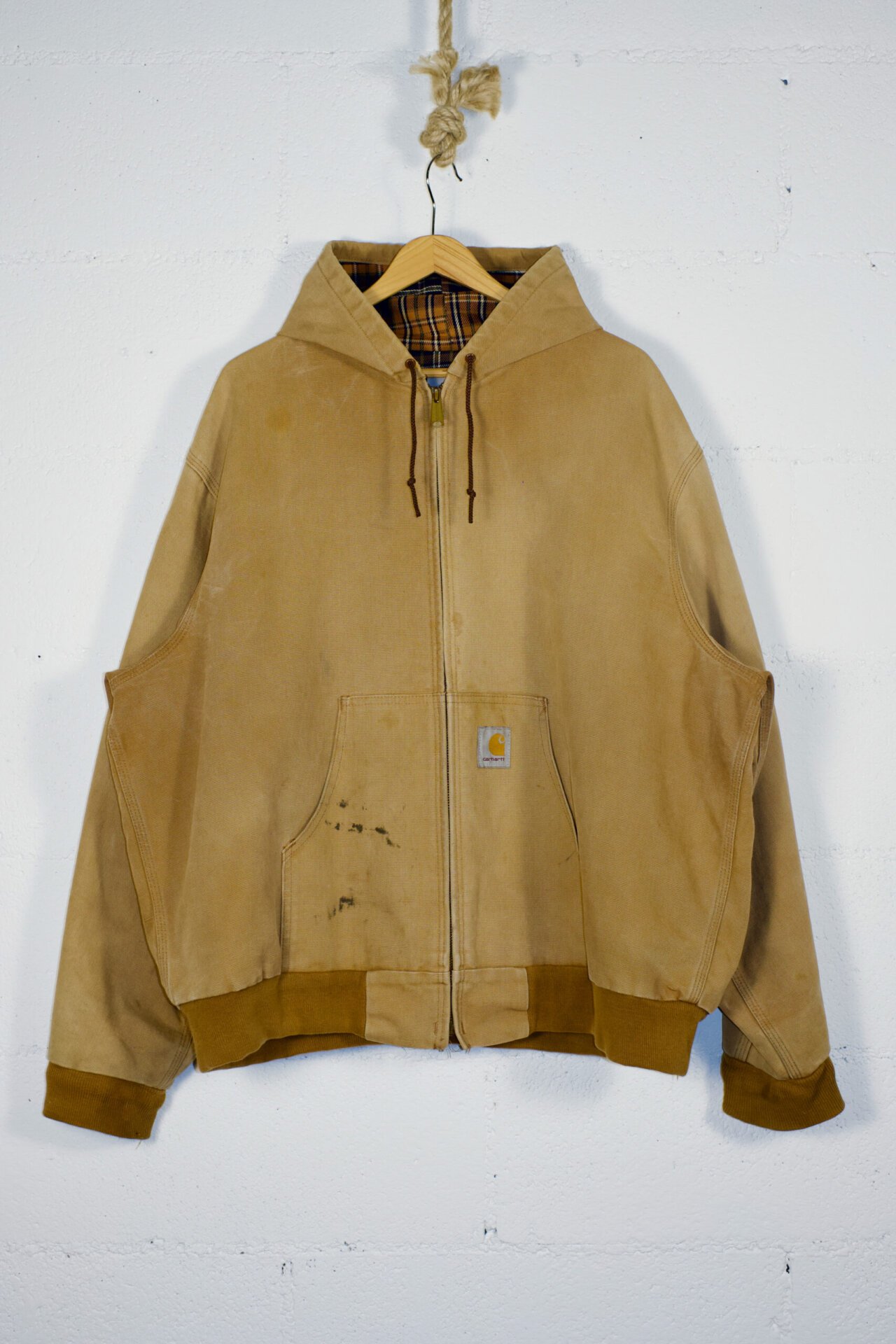 Hooded work jacket with tartan fabric lining, front zipper closure.