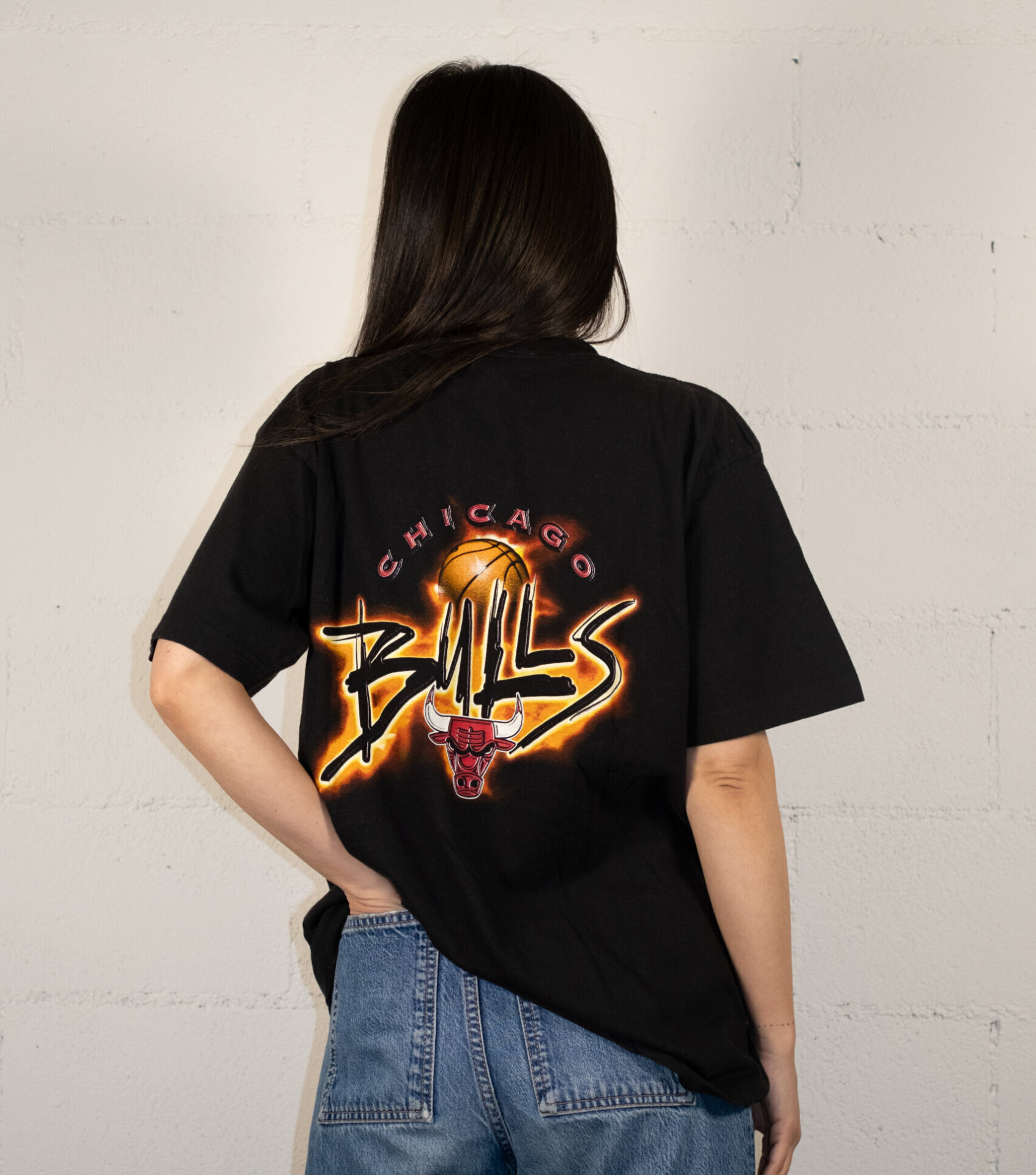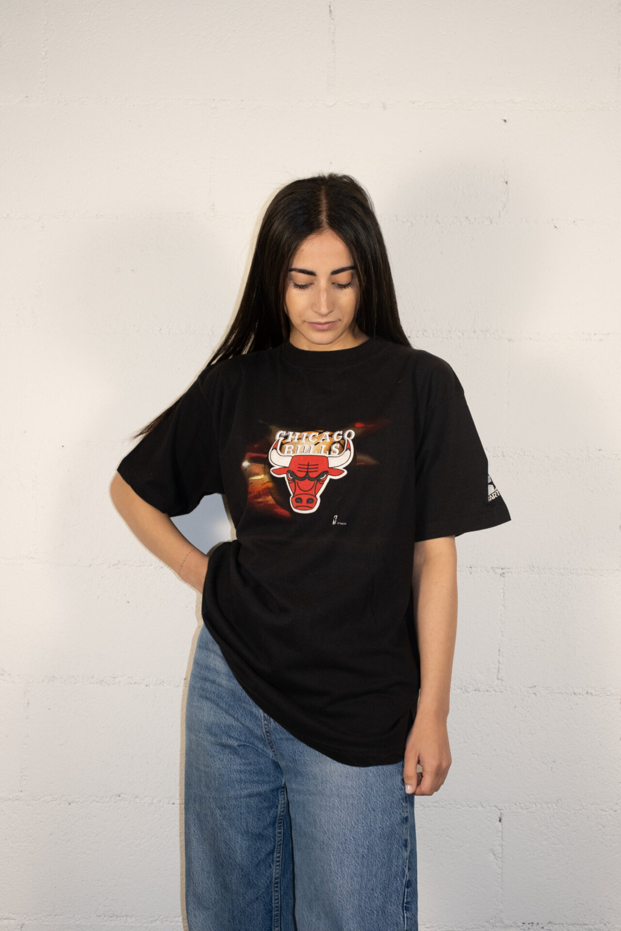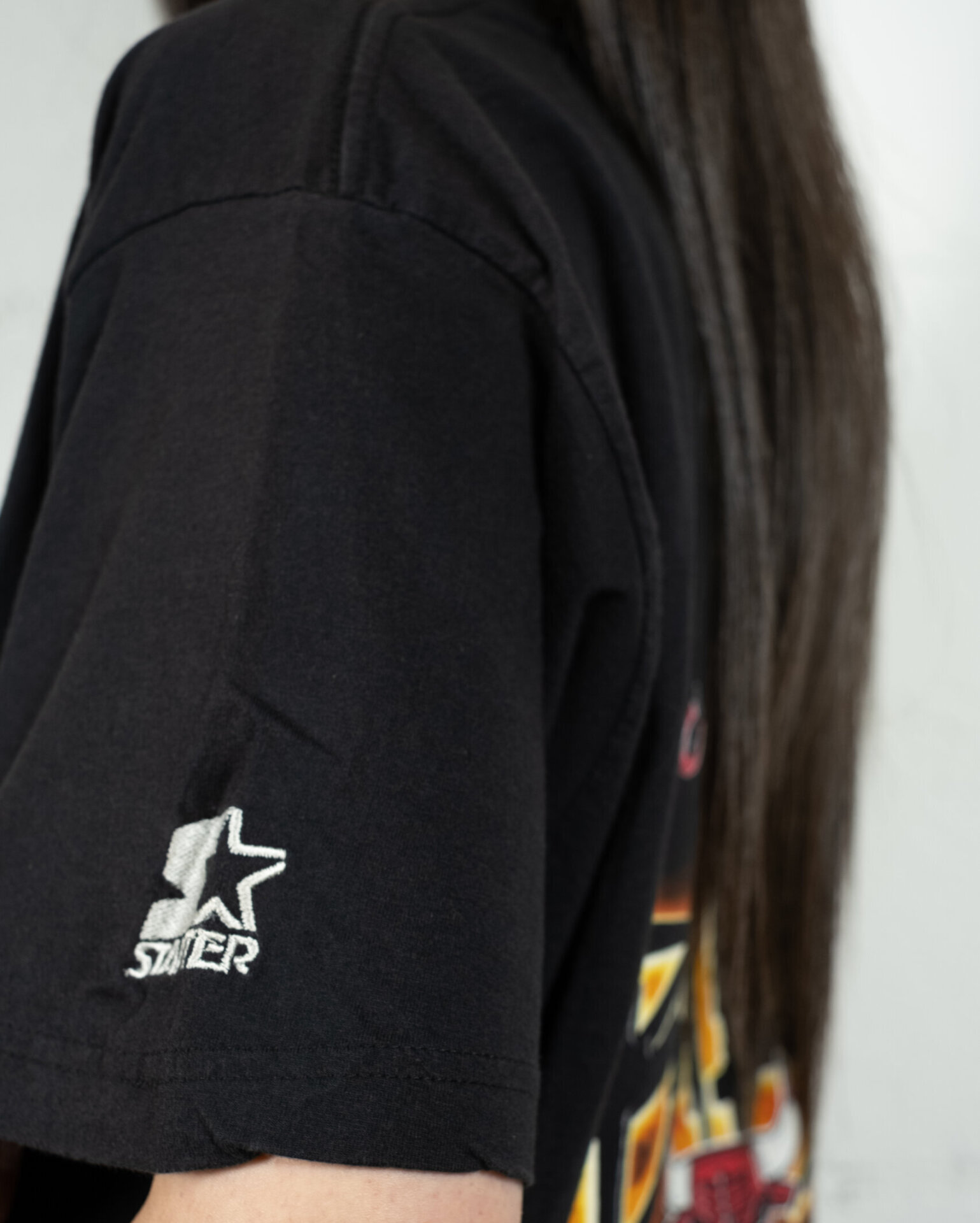 Black NBA Starter T-shirt with Chicago Bulls print and embossed front logo. Made of soft cotton, it combines comfort and streetwear style. Regular fit, perfect for a sporty and casual look.