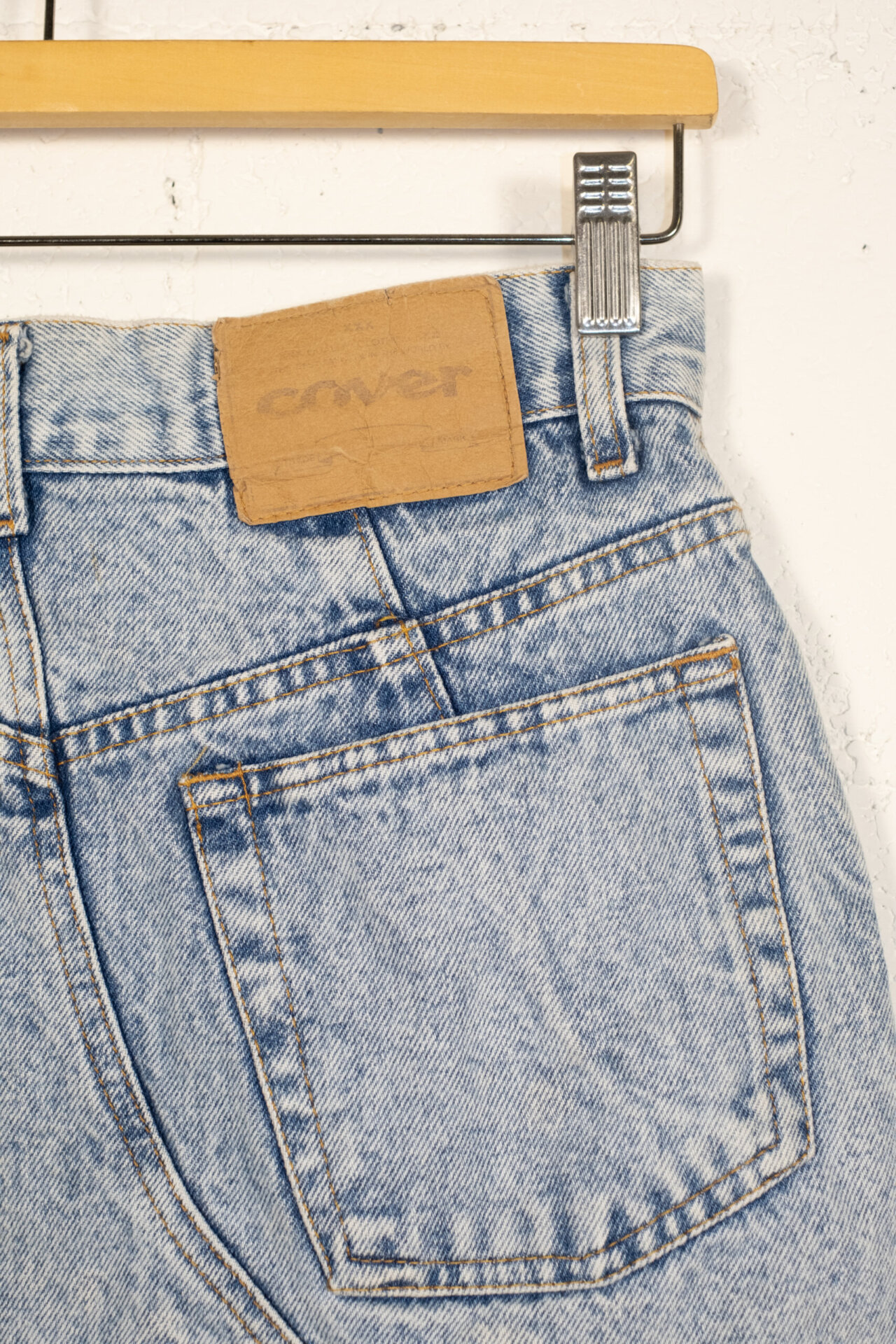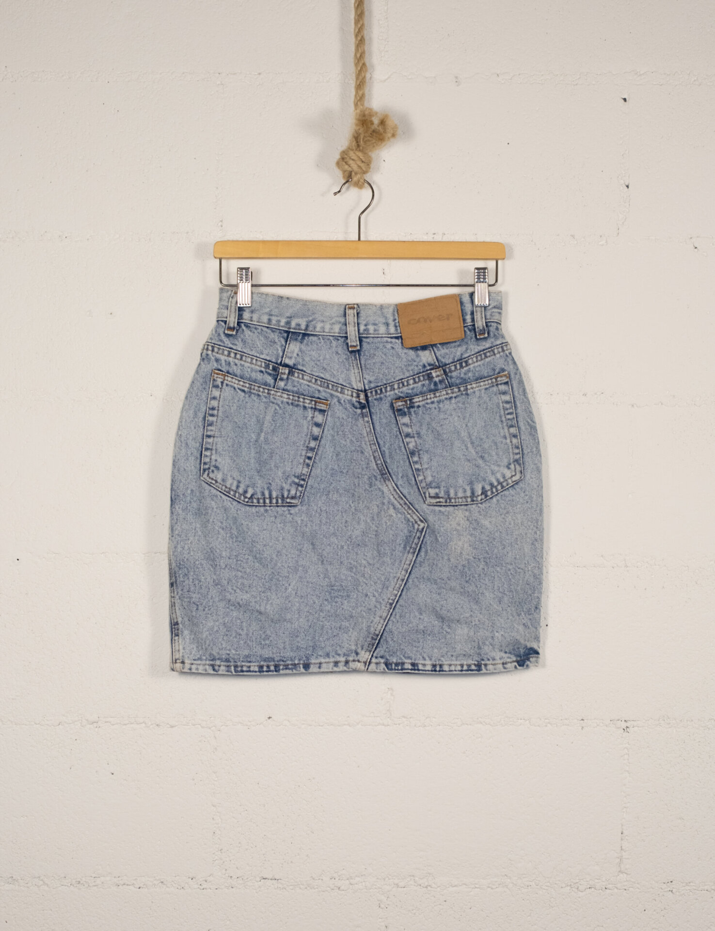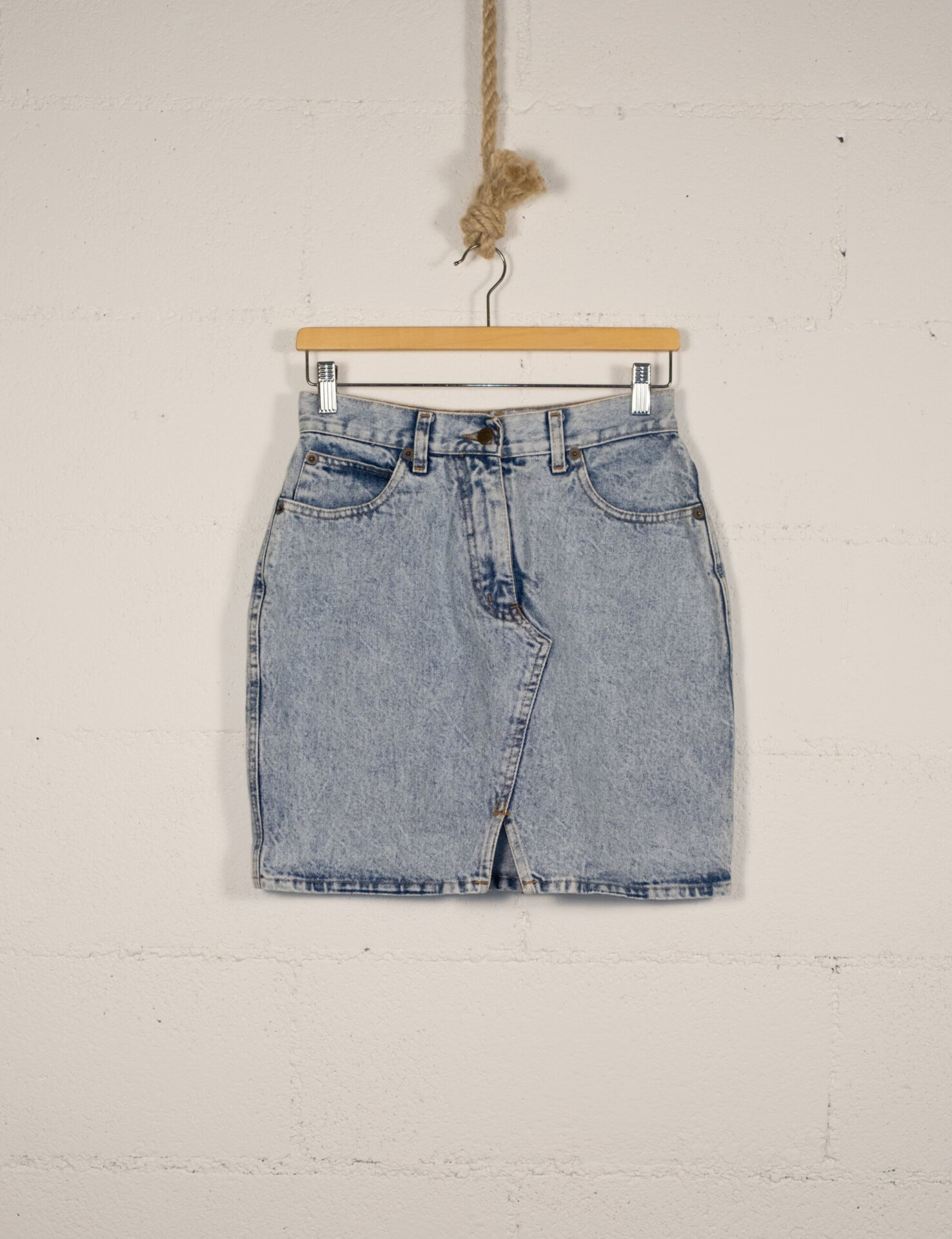 Over-the-knee denim skirt, straight line, high waist and front zip and button fastening. Front slit.