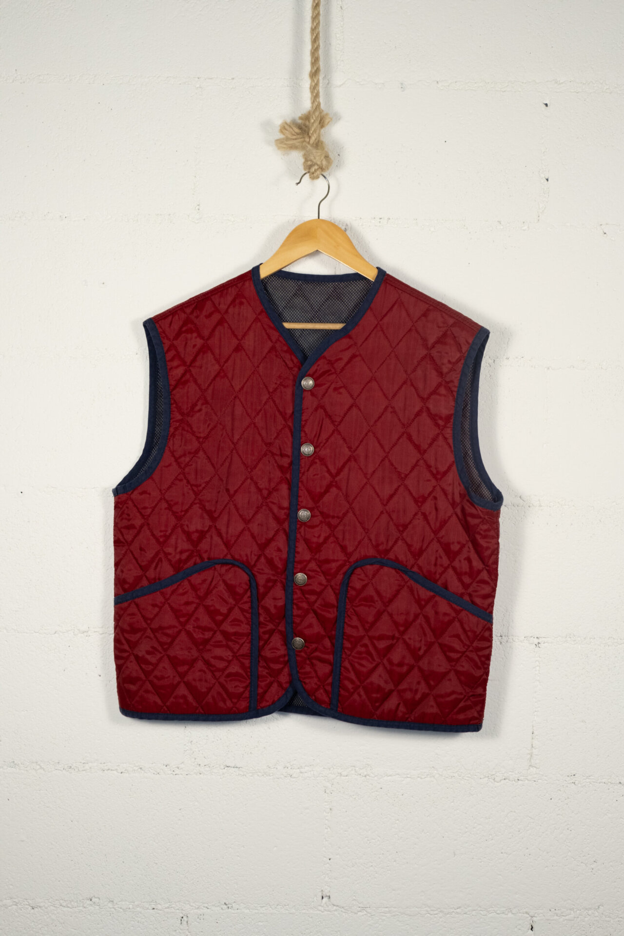 A burgundy quilted waistcoat with elegant contrasting blue edging and metal buttons. Clean lines and casual-chic style, ideal for mid-season. The light padding offers comfort and warmth without weighing you down, perfect to wear over shirts or jumpers.