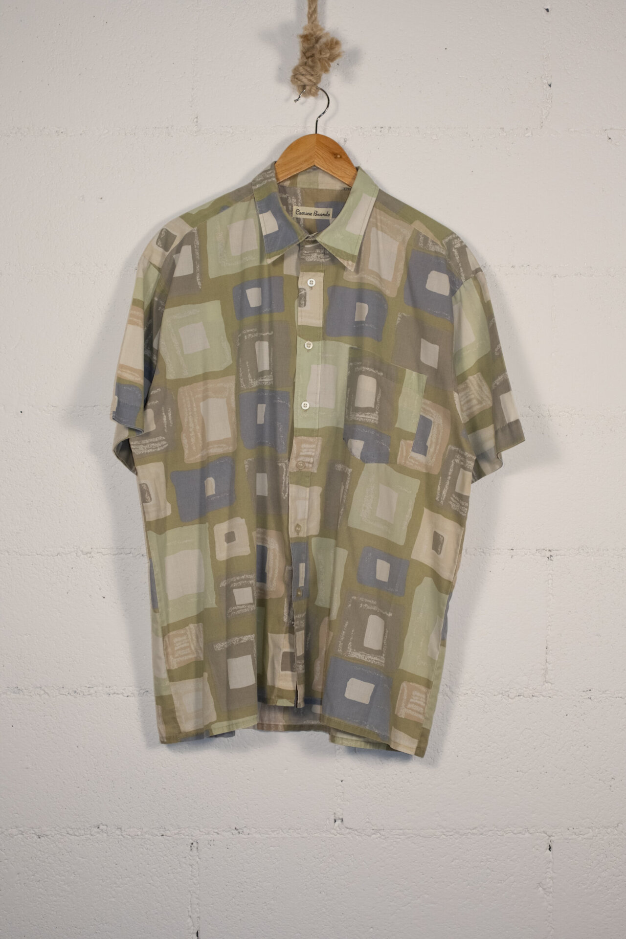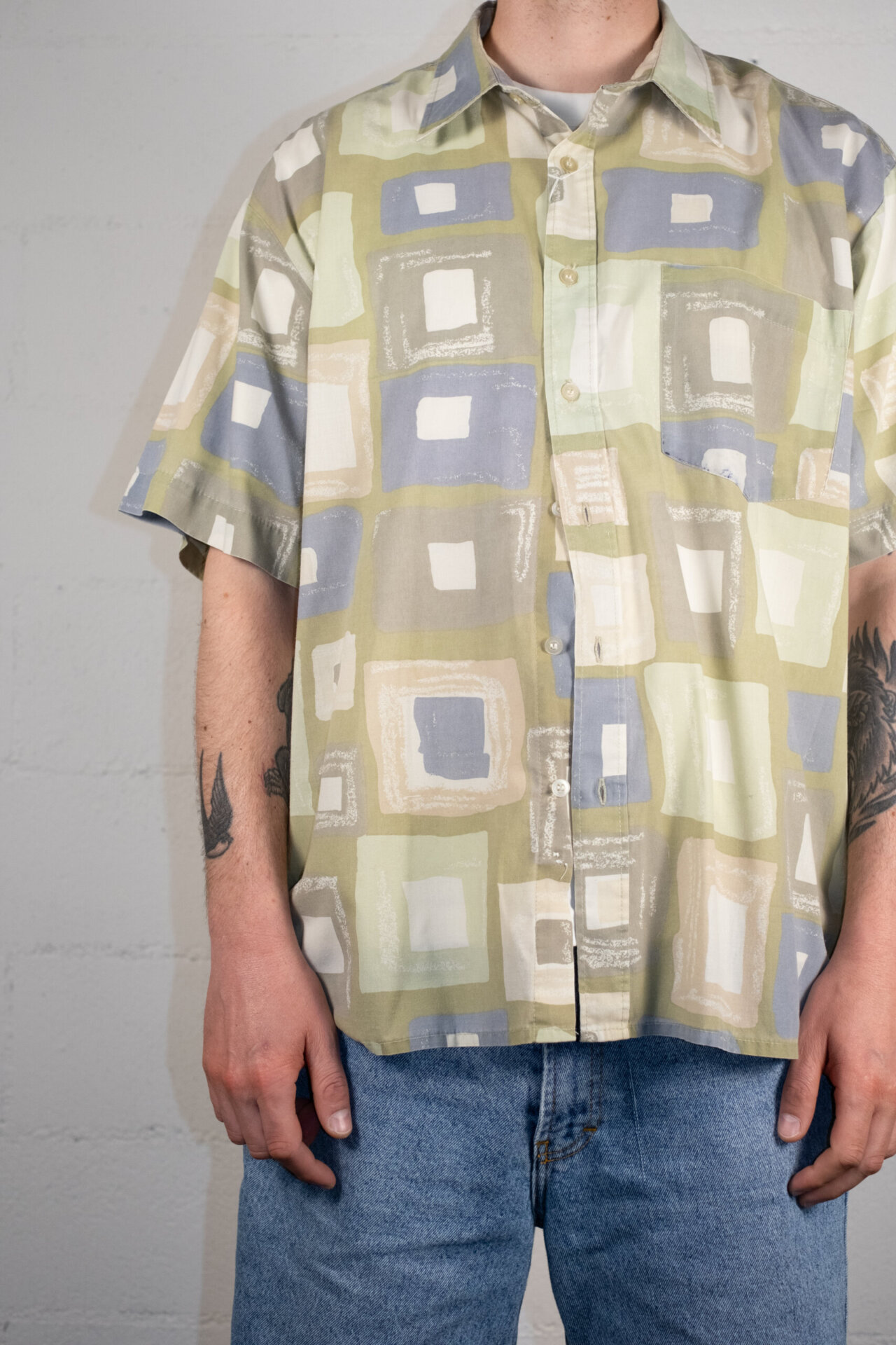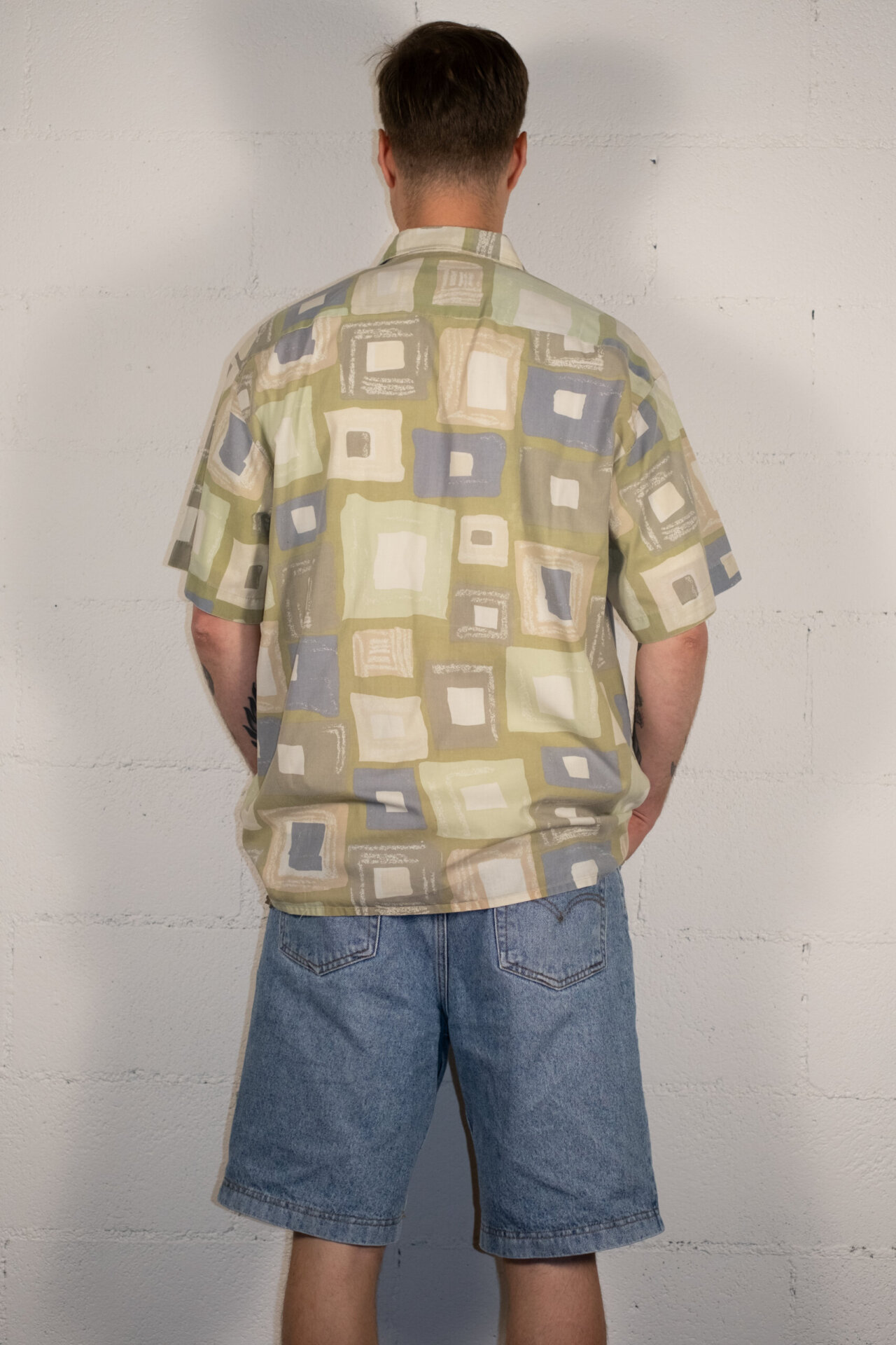 Vintage 80s short-sleeved shirt with front button placket and classic collar. Check pattern in pastel shades, retro style ideal for casual or 80s revival looks. Comfortable fit, perfect for summer outfits.