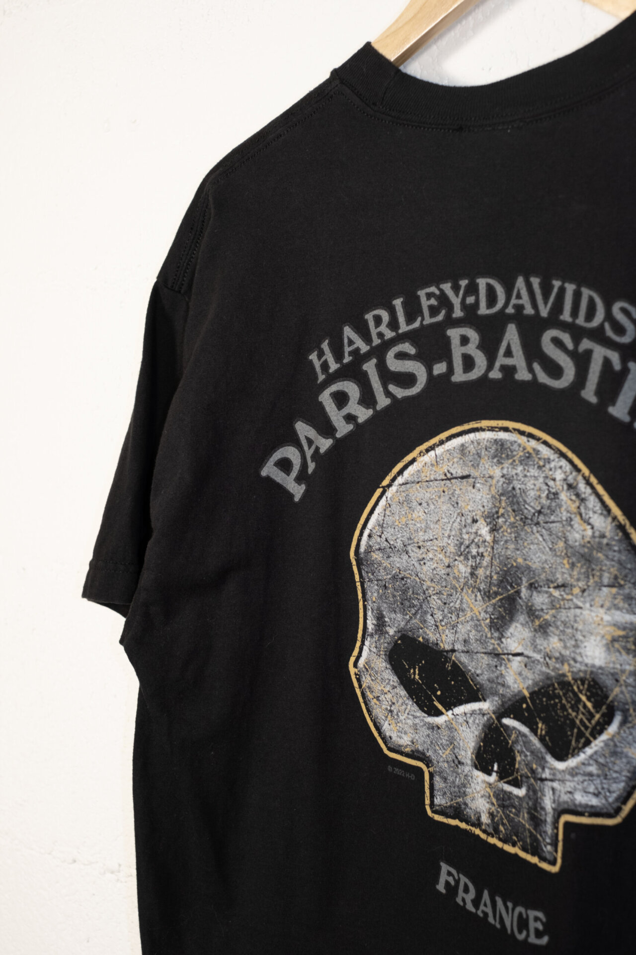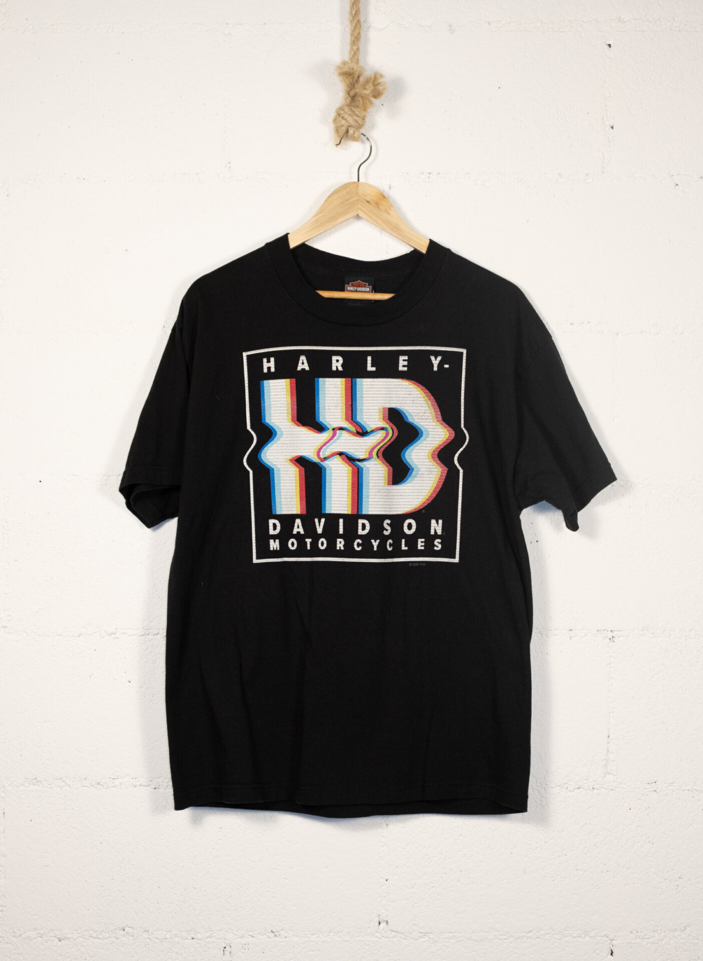 Black Harley-Davidson T-shirt with bold front print in 90s biker style. Iconic skull and engine graphic, loose fit and rebellious attitude. Must-have for lovers of streetwear and motorcycle culture. One-of-a-kind piece.