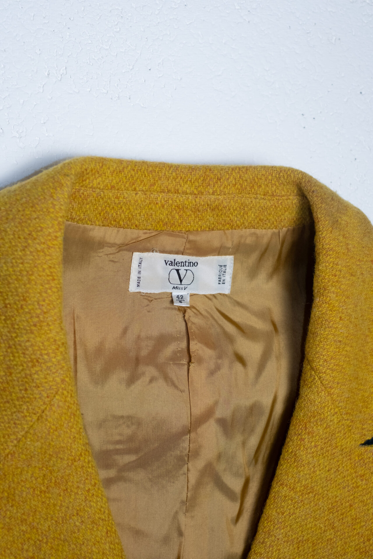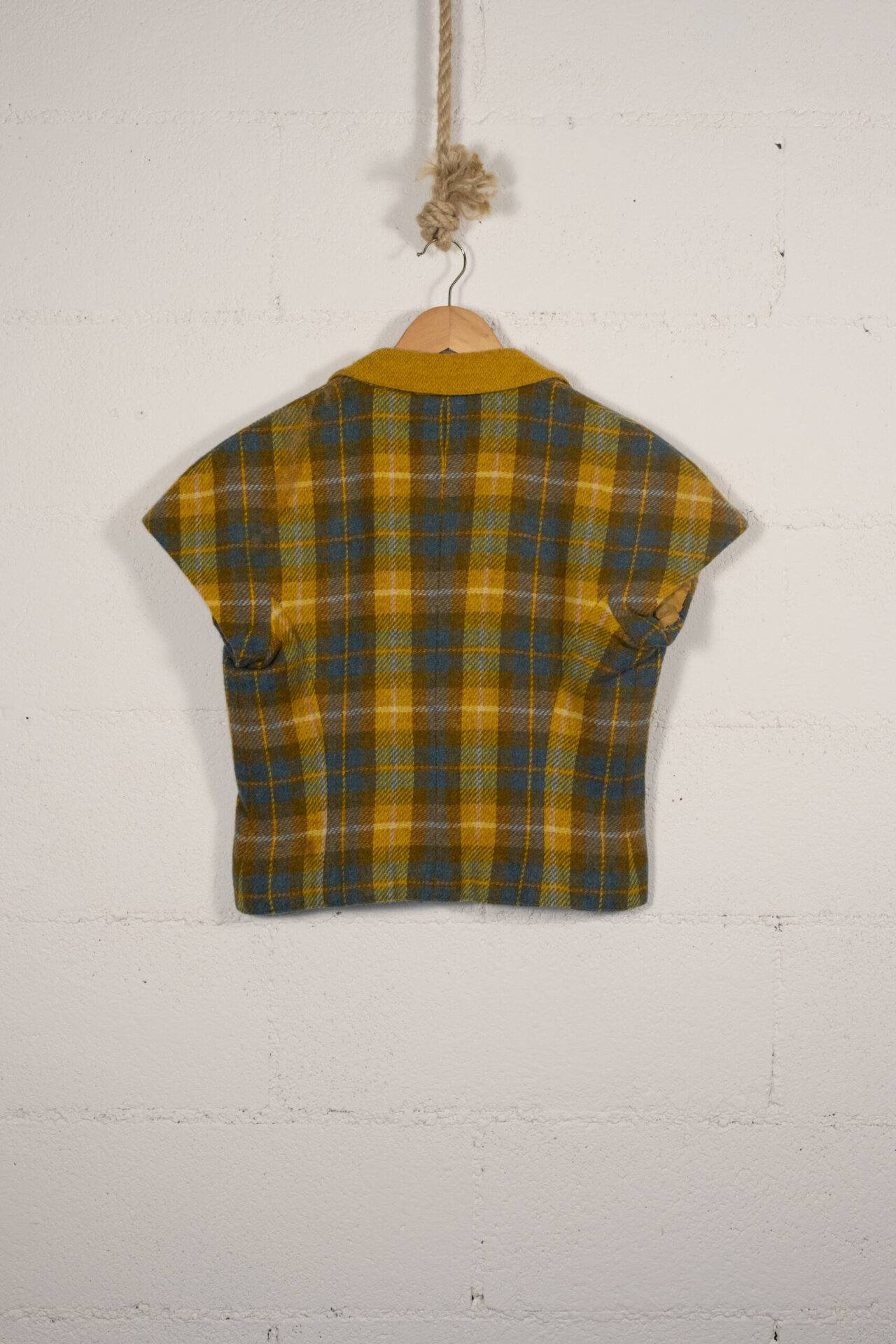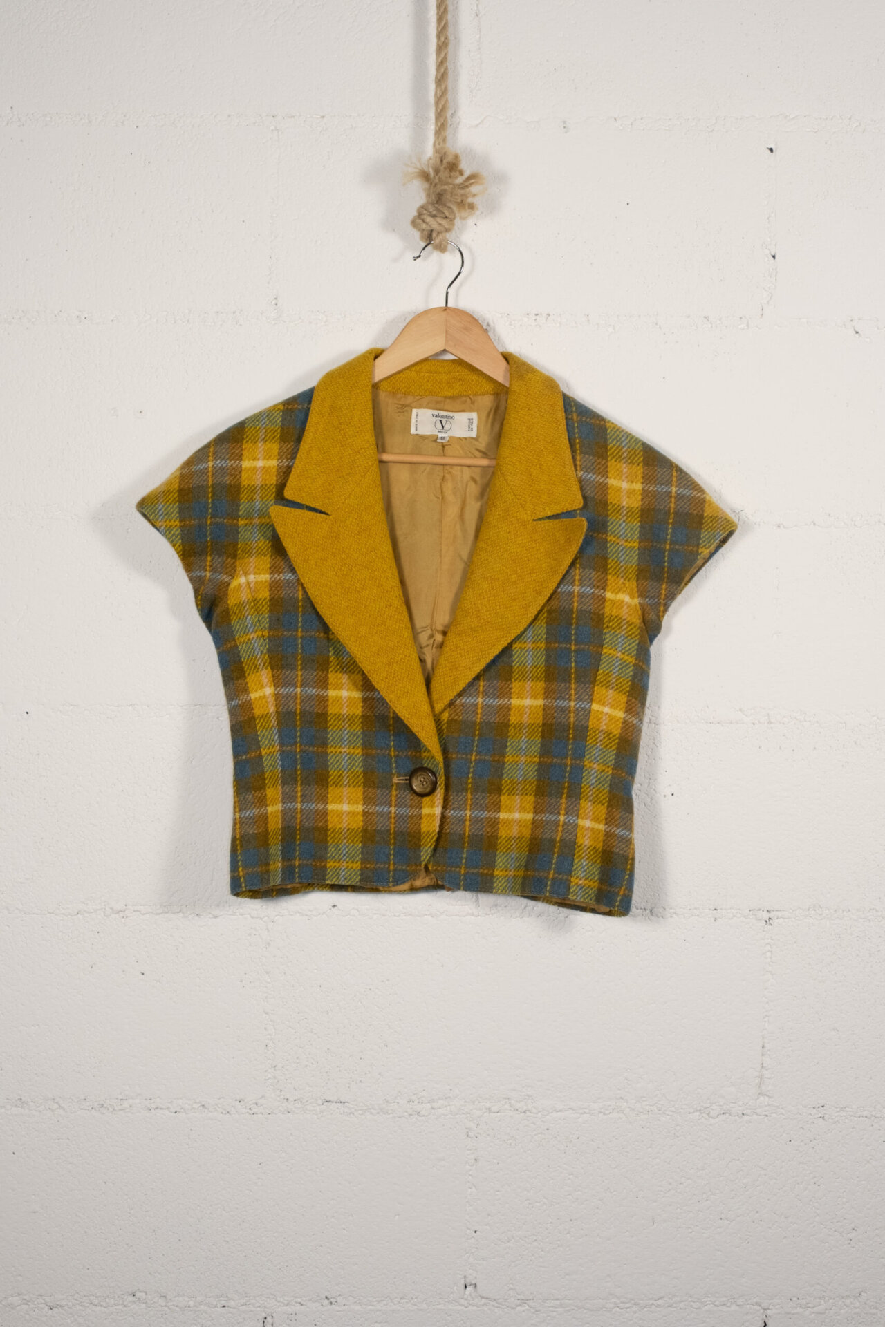 Refined short-sleeve blazer by Valentino. Made of high-quality wool, this impeccably fitted piece is perfect for the spring season or for formal occasions that require a touch of class. The plaid pattern in shades of mustard and light blue adds a modern and sophisticated accent, making it a versatile piece to pair with a variety of outfits.