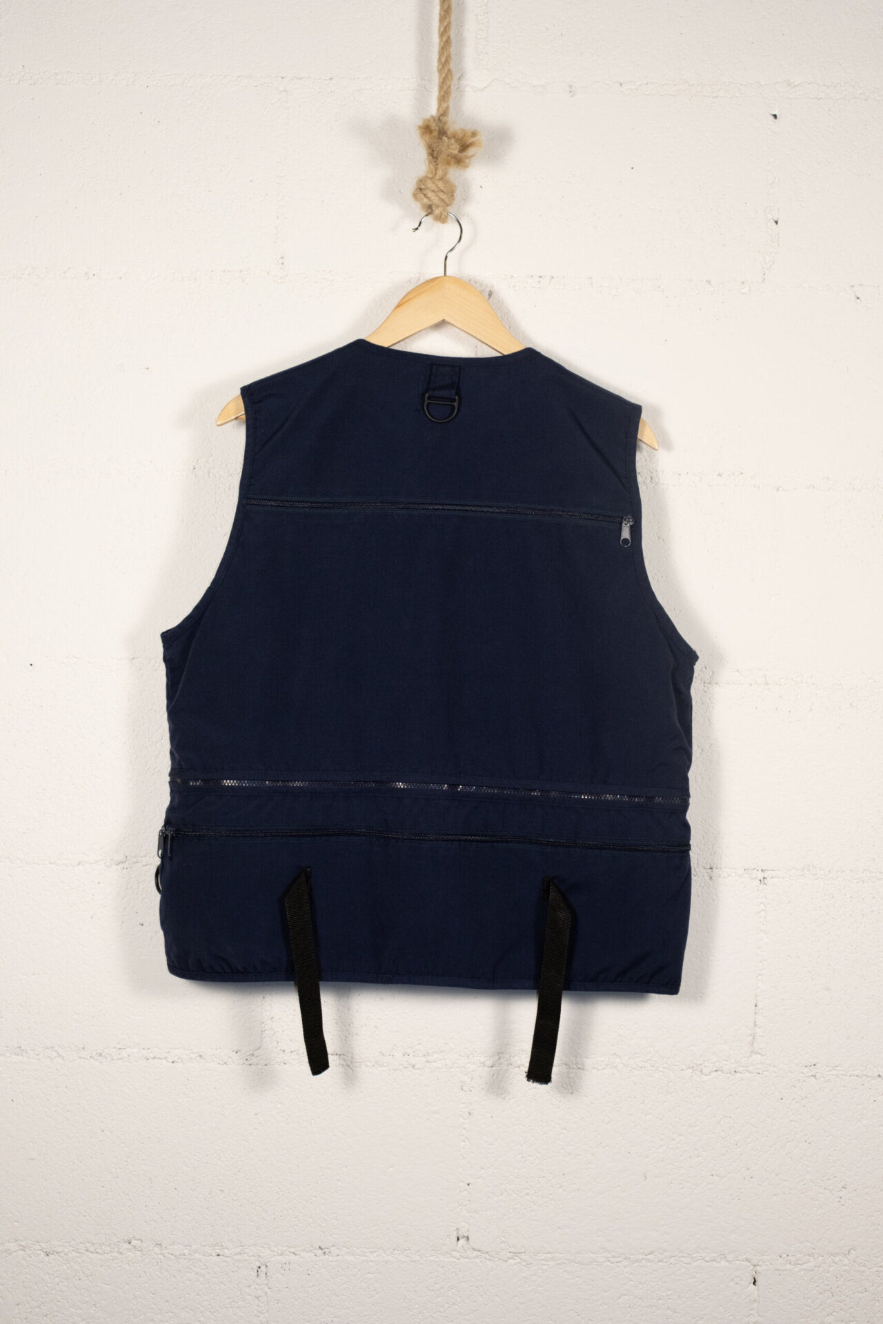 Blue technical fabric fishing waistcoat, lightweight and durable. Equipped with multiple front pockets with zip and button fastening to conveniently organise equipment and small accessories. Comfortable fit, ideal for outdoor outings. Functional design offering practicality and freedom of movement.