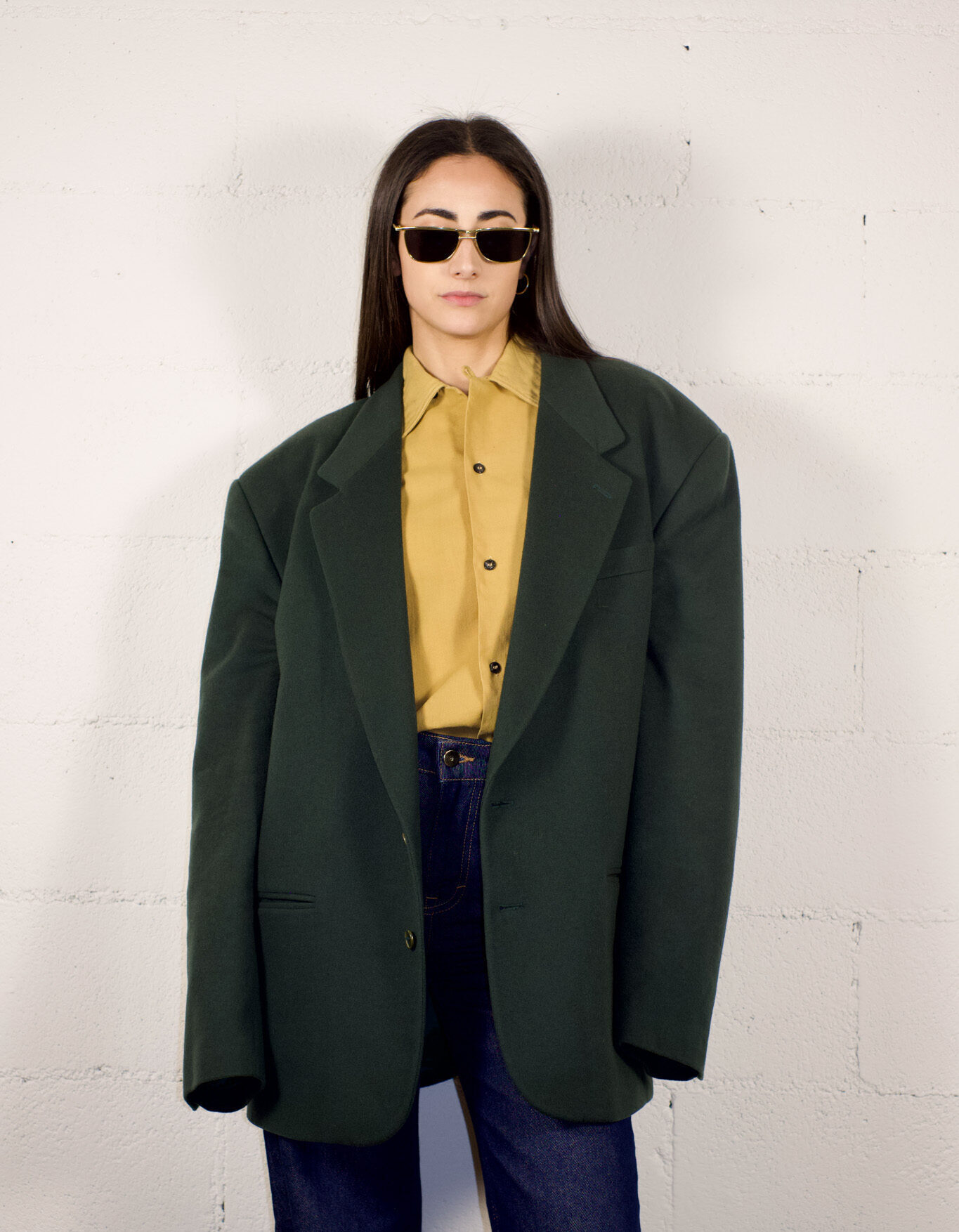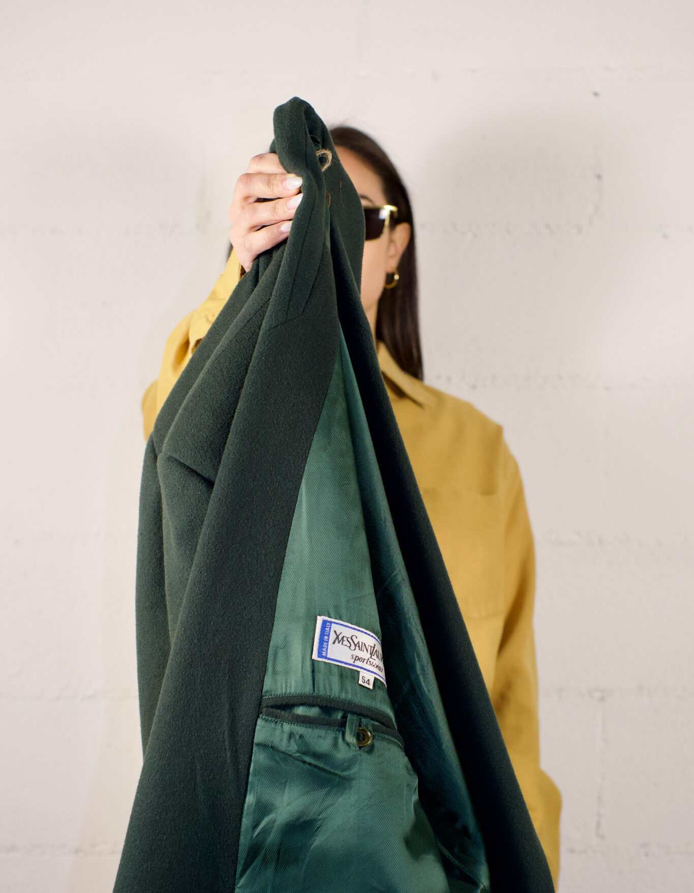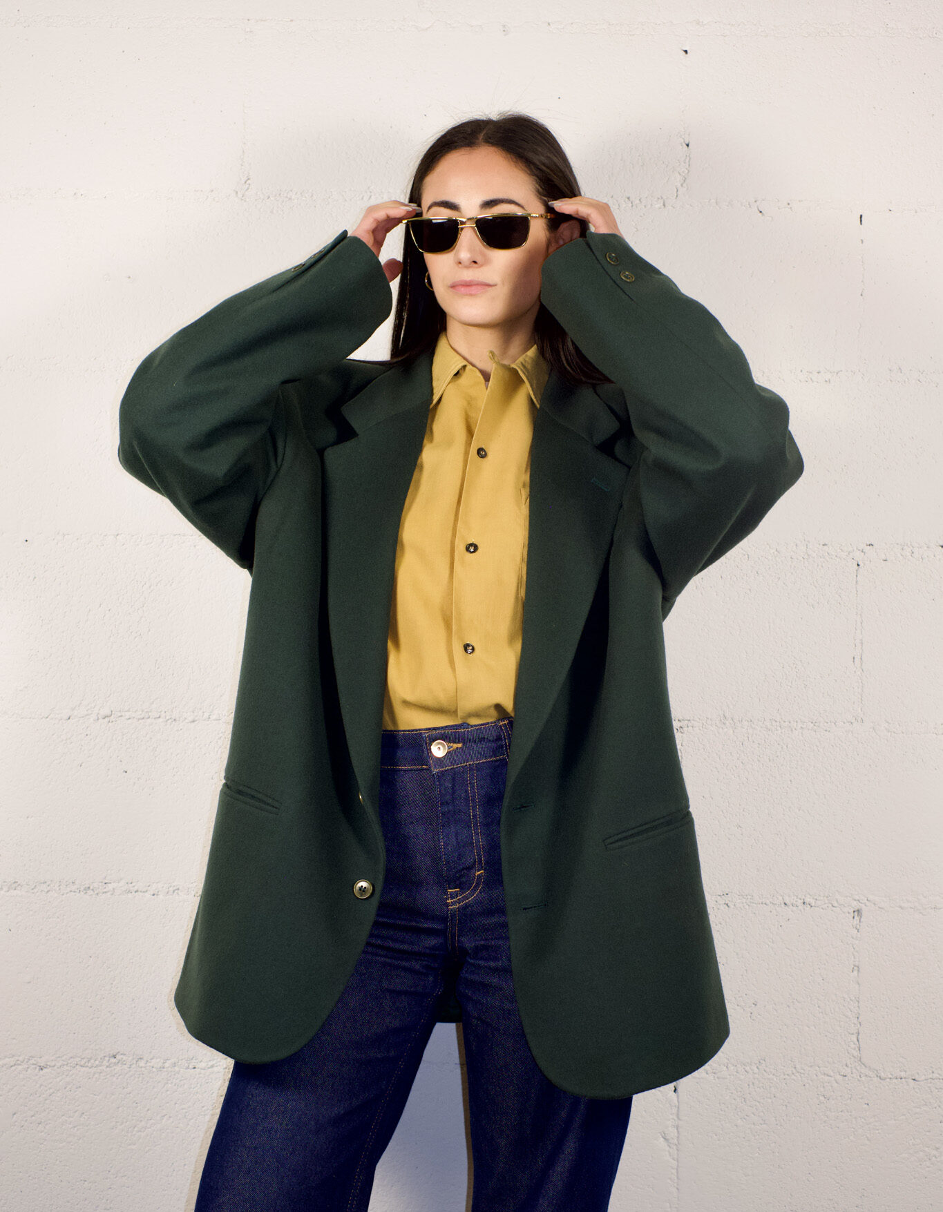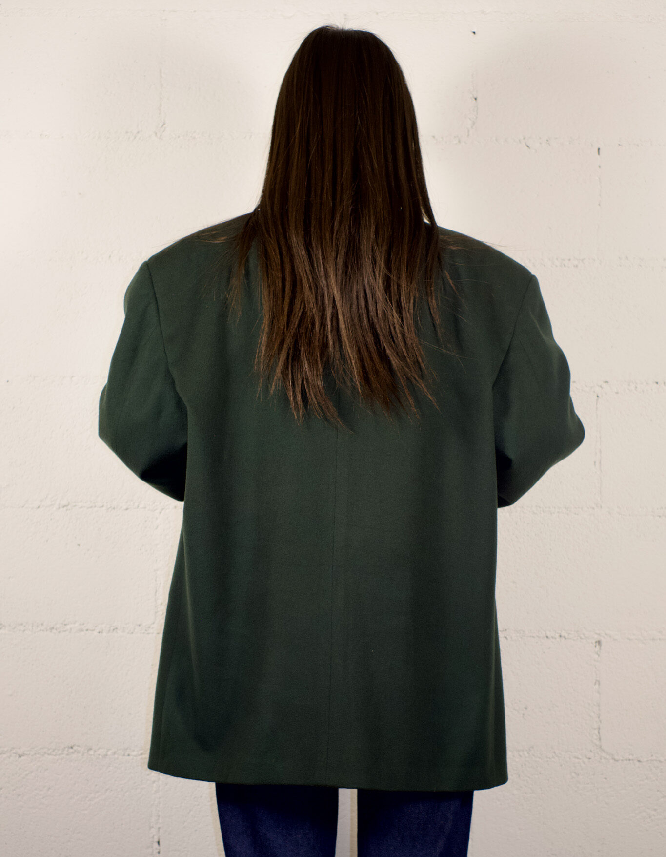 Dark green wool tailored blazer features classic lapels and welt pockets.