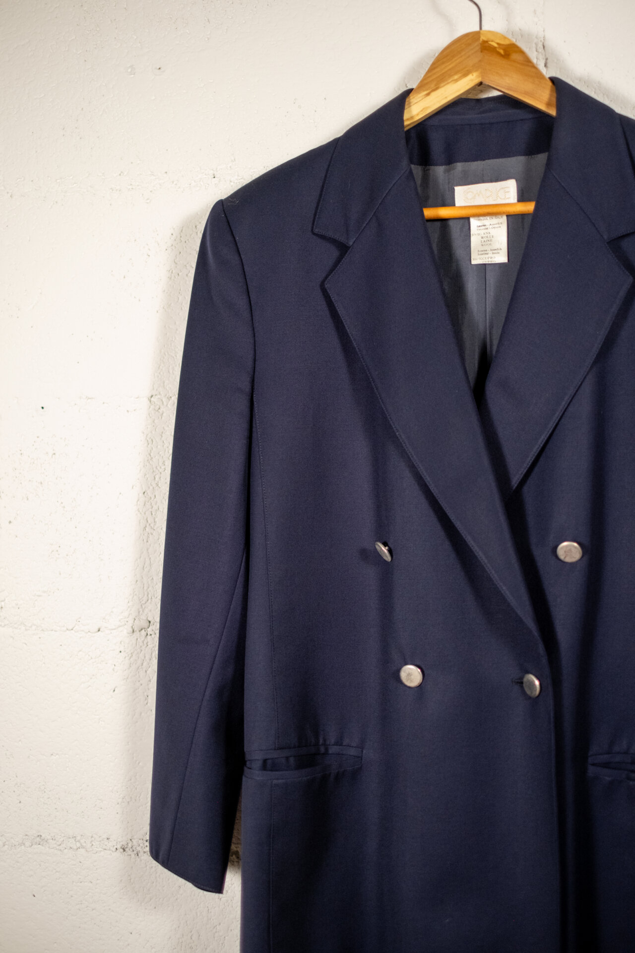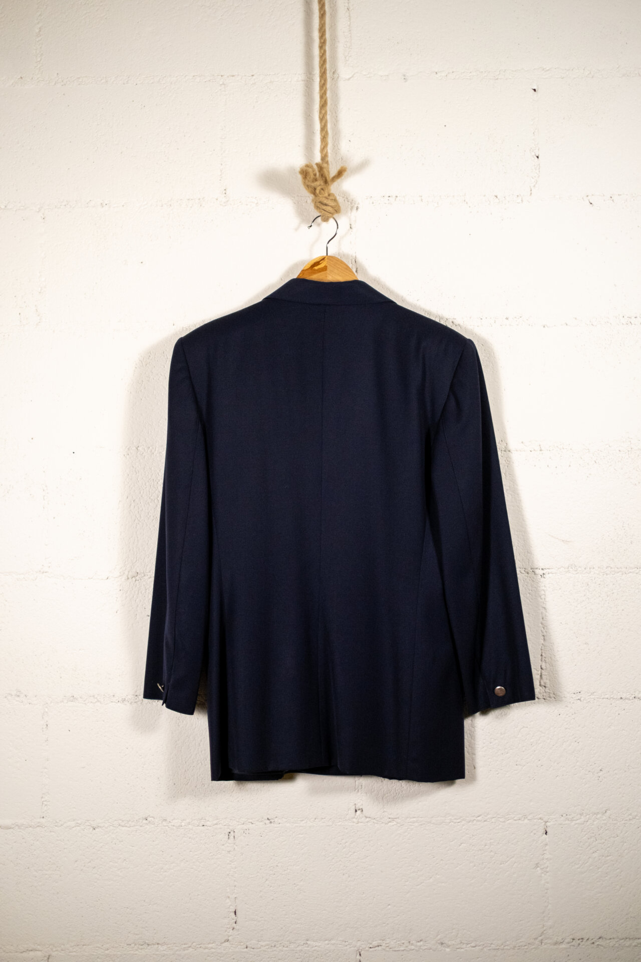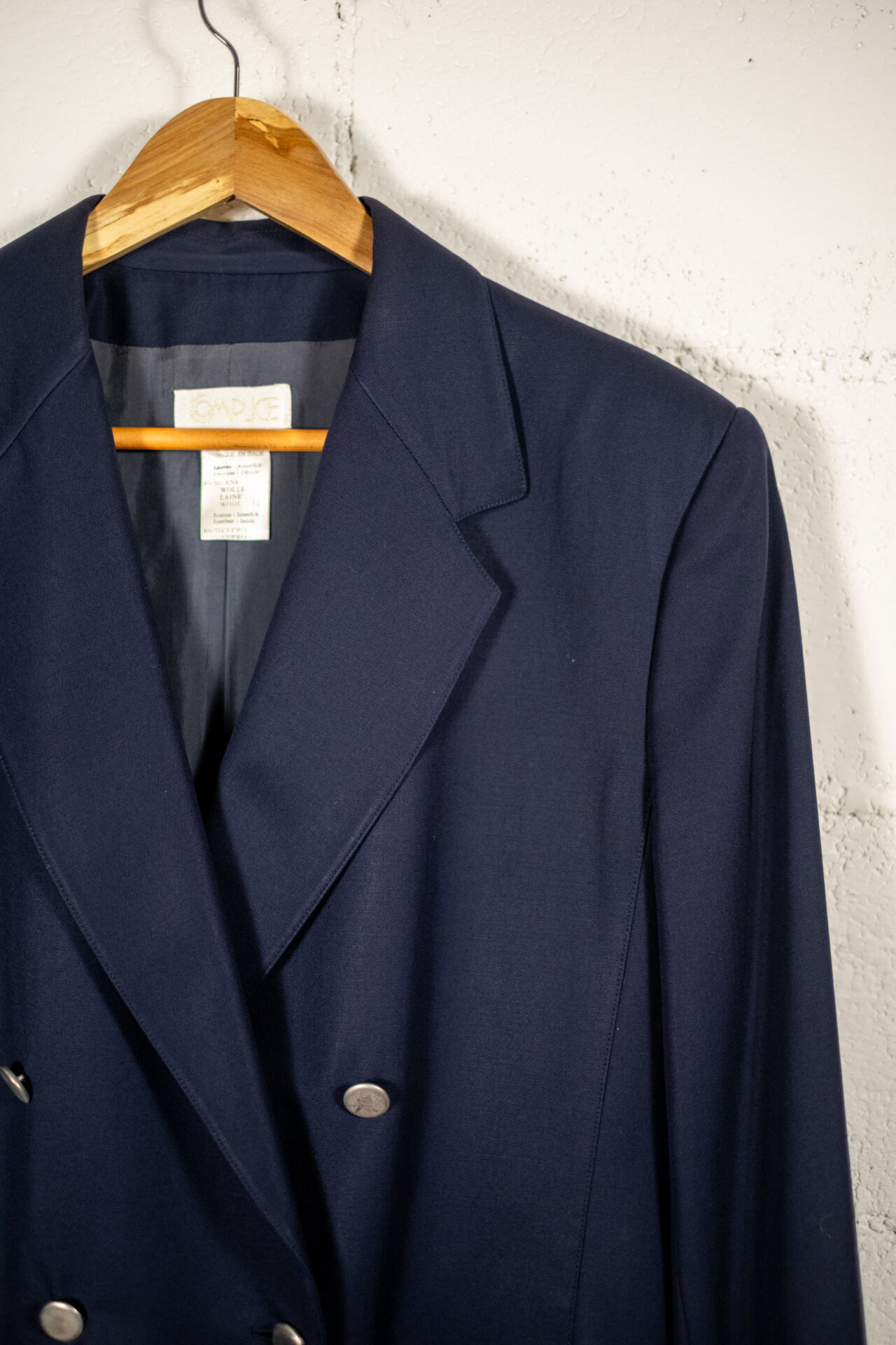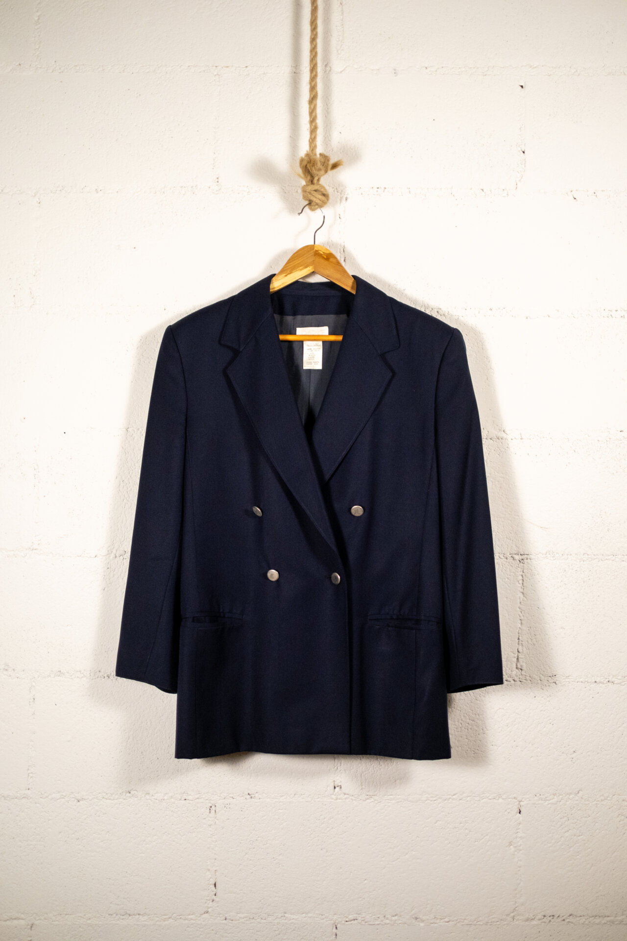 Blazer vintage donna blu navy, modello doppiopetto dal taglio sartoriale e linea strutturata. Realizzato in tessuto a base lana, con rever ampi e bottoni metallici che ne esaltano lo stile classico.