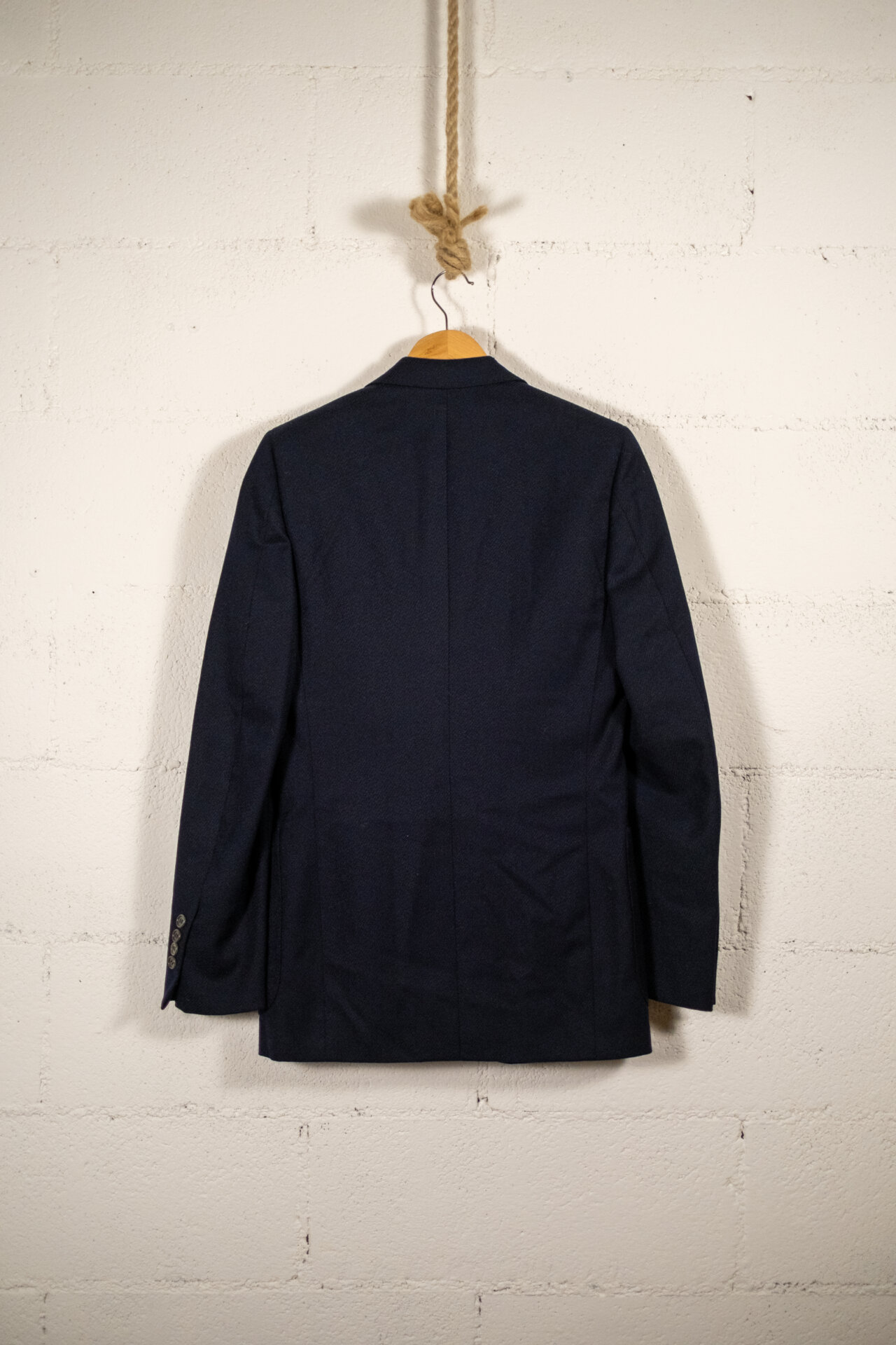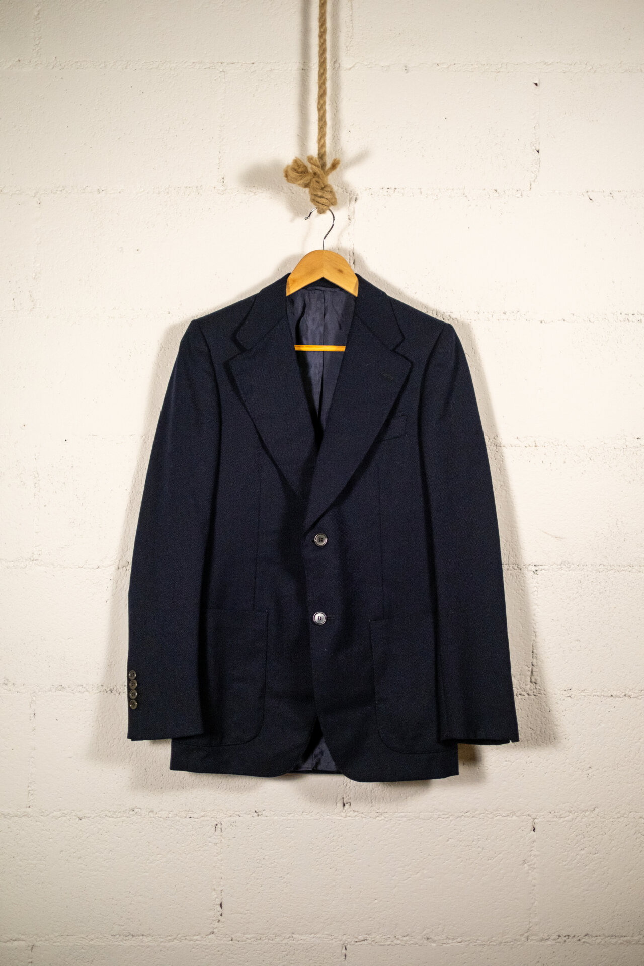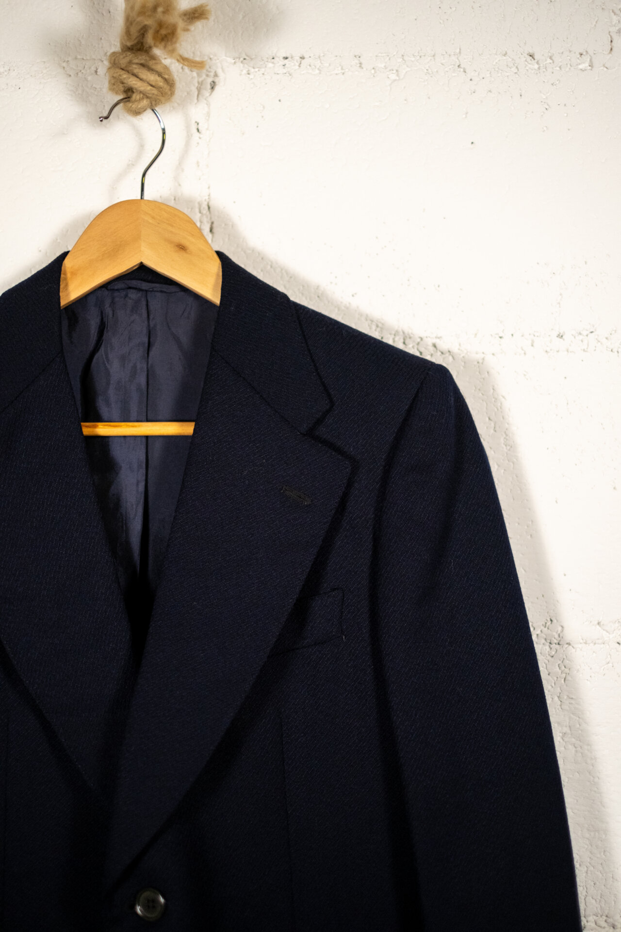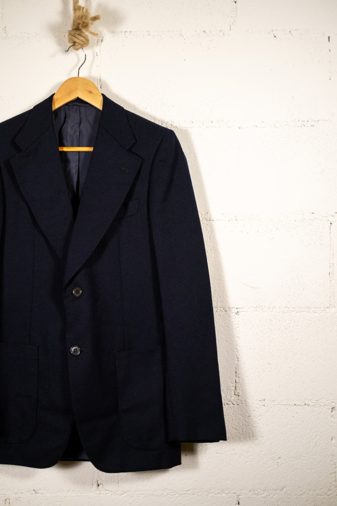 Blazer vintage color blu navy, modello monopetto con chiusura a due bottoni e rever classico. Il tessuto presenta una texture leggera che dona profondità al colore mantenendo un’estetica pulita e raffinata.