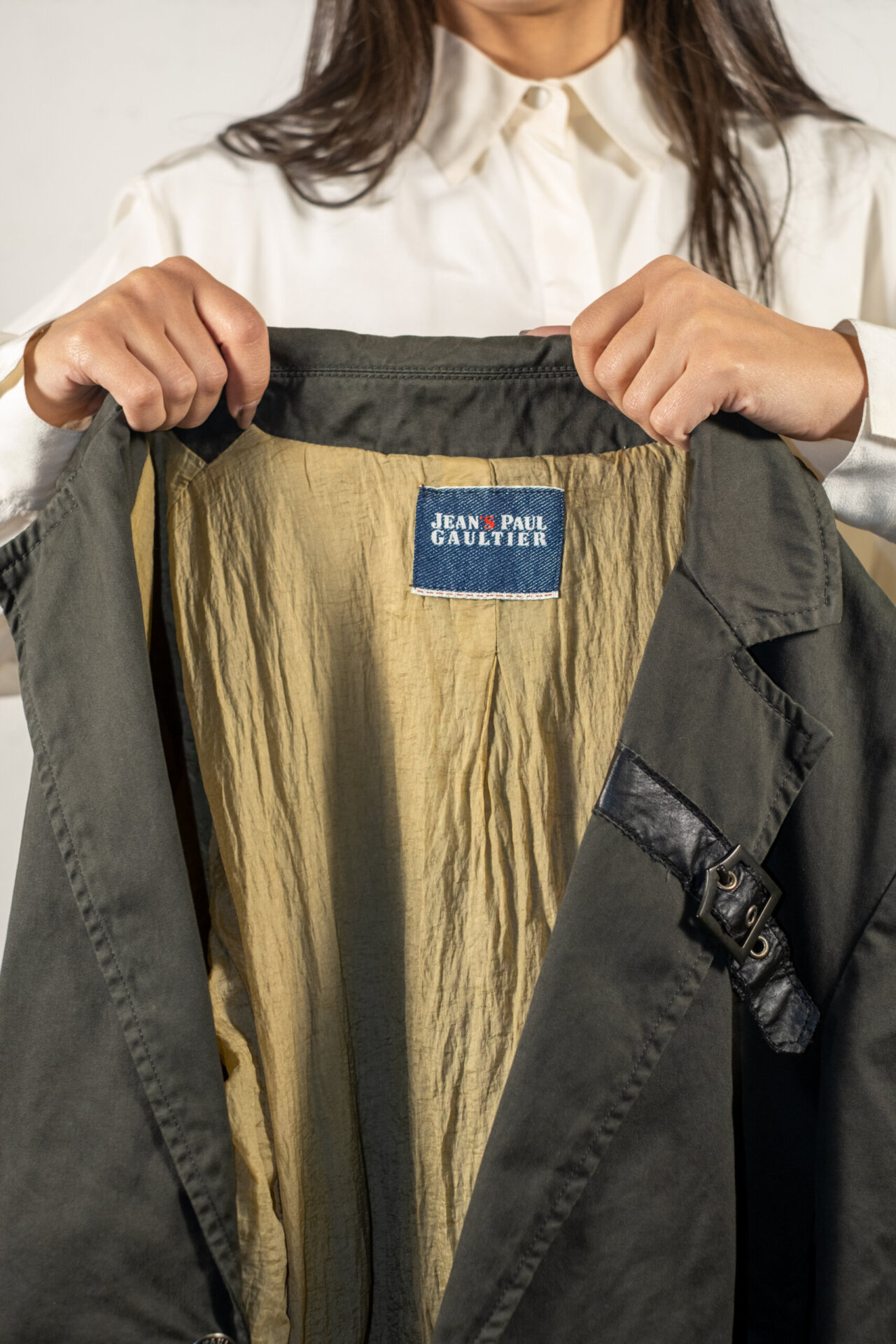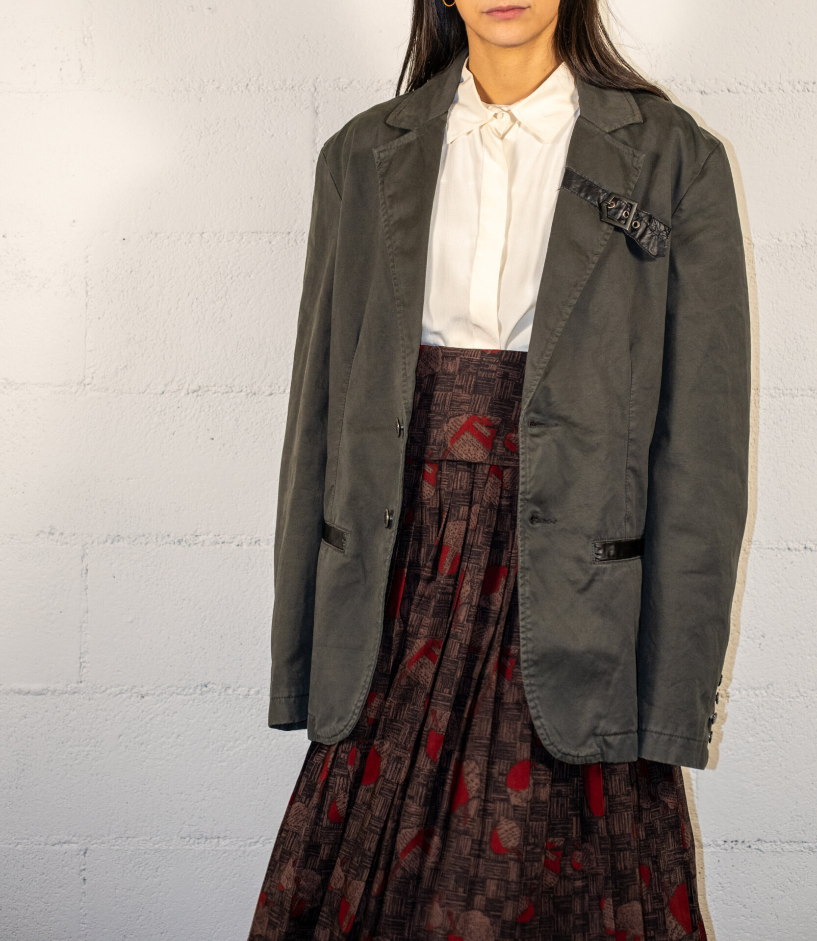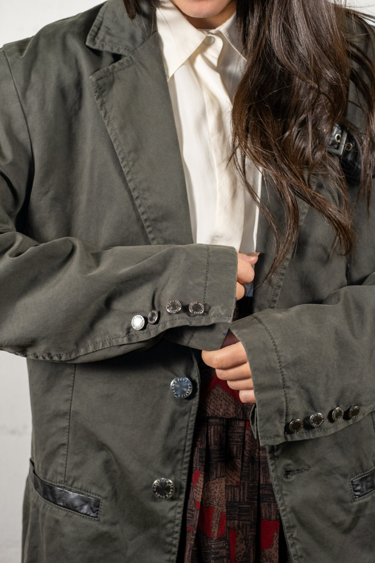 Blazer dal taglio maschile in cotone verde militare con dettagli in pelle nera e cintura regolabile sul retro. Chiusura a due bottoni, tasche laterali e bottoni logati sui polsini. Capo unico dallo stile androgino e deciso, perfetto per look casual o urban chic.
