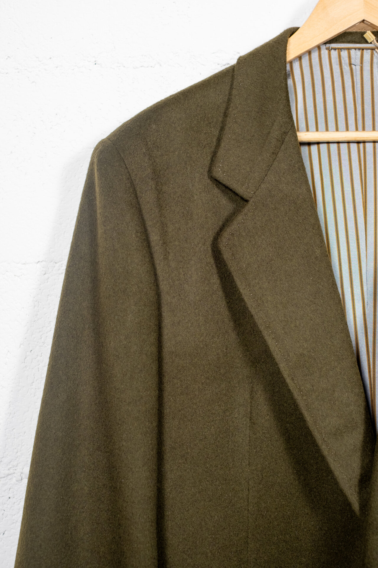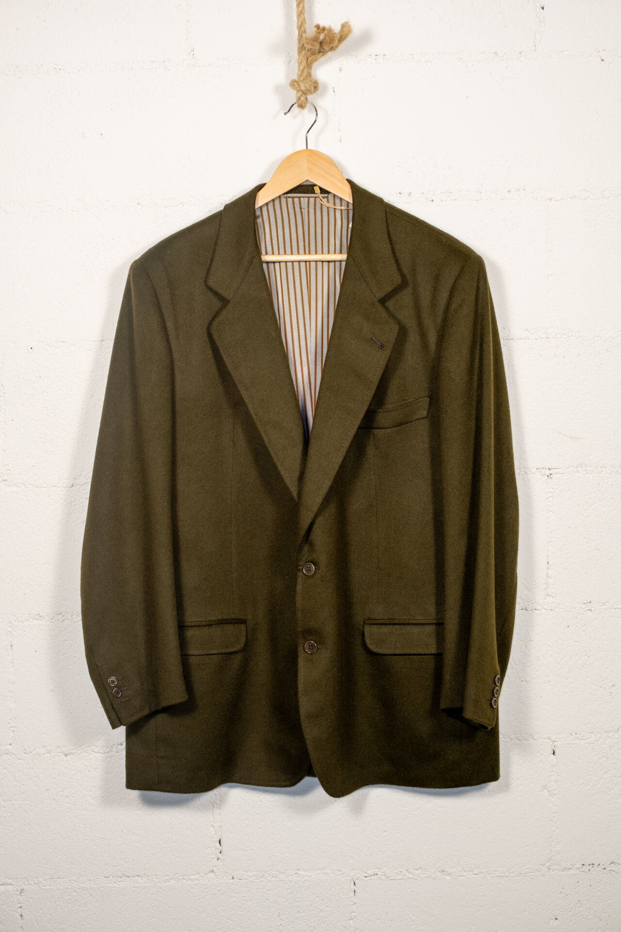 Blazer vintage in lana color verde oliva, dal taglio sartoriale classico e dalla linea equilibrata. Presenta chiusura frontale a due bottoni, rever tradizionale, tasche con patta e fodera interna a righe, dettaglio che ne valorizza l’estetica originale.