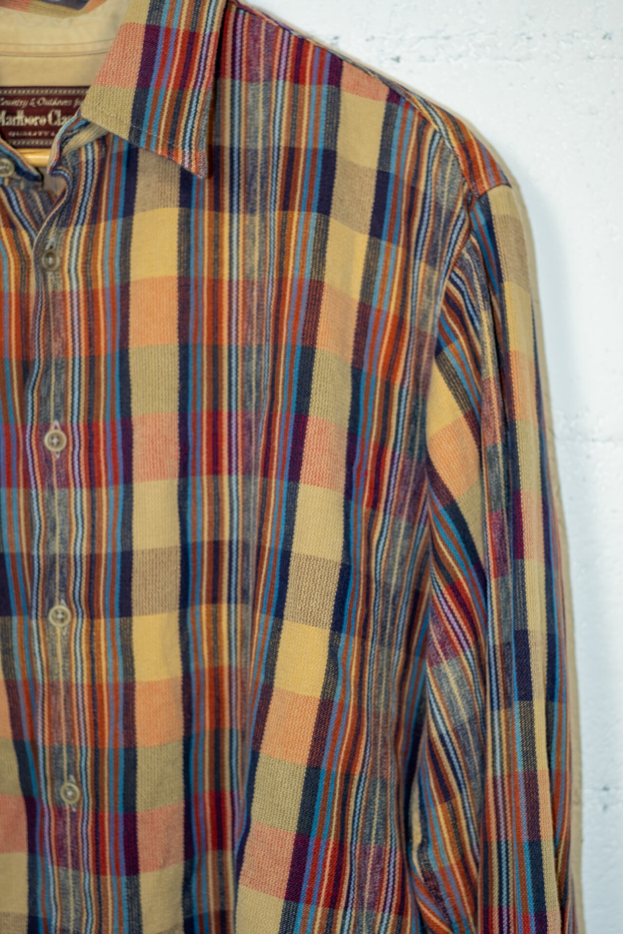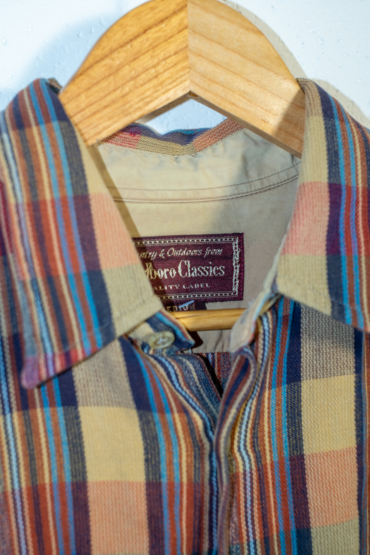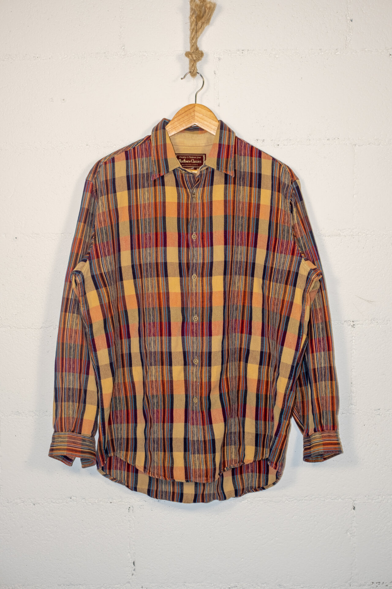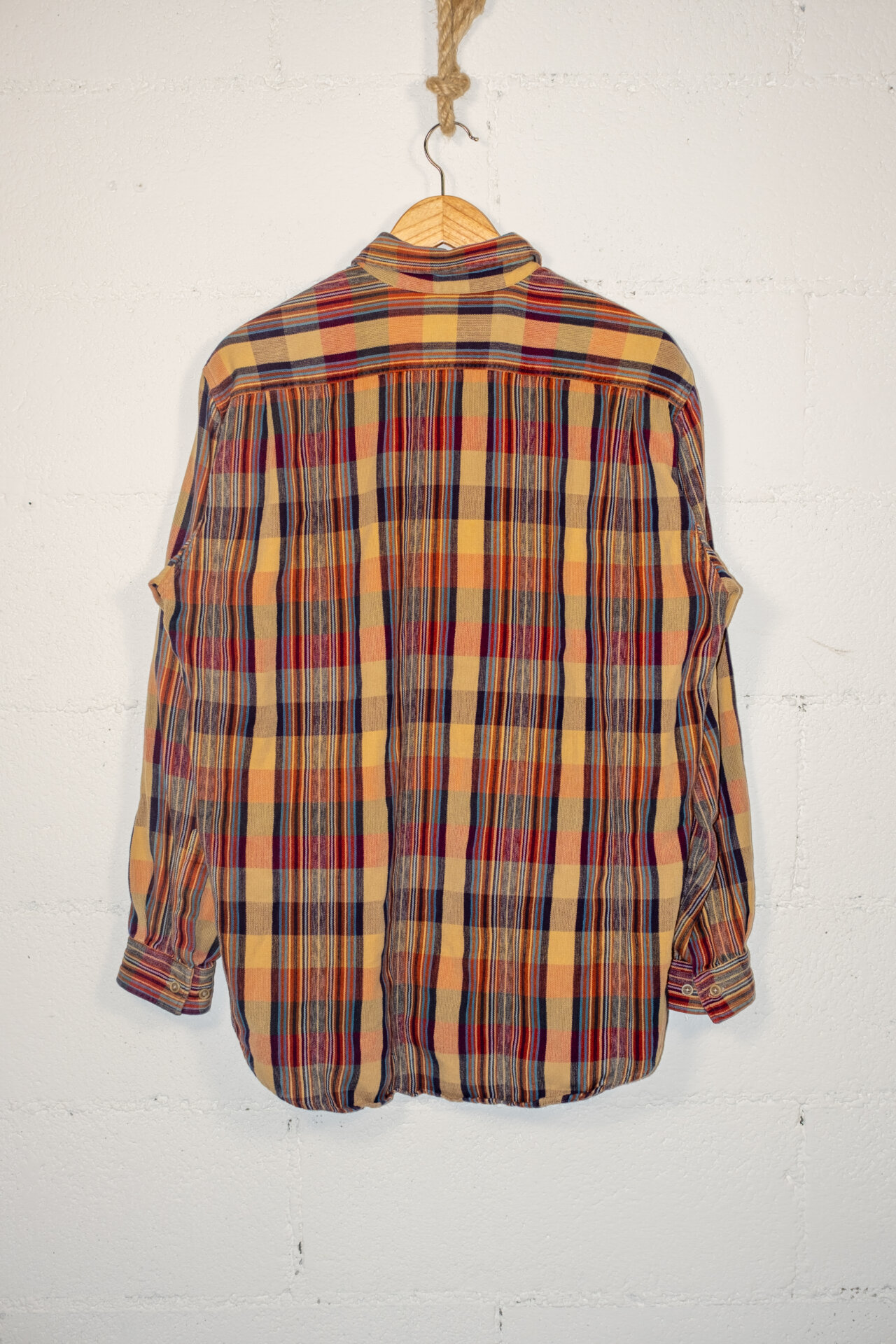 Camicia vintage Marlboro Classics in cotone a quadri multicolor, dallo stile heritage e workwear. Presenta chiusura frontale a bottoni, colletto classico e vestibilità regolare. Il tessuto morbido e il pattern caldo richiamano l’estetica americana anni ’90, rendendola ideale per look casual e stratificati.