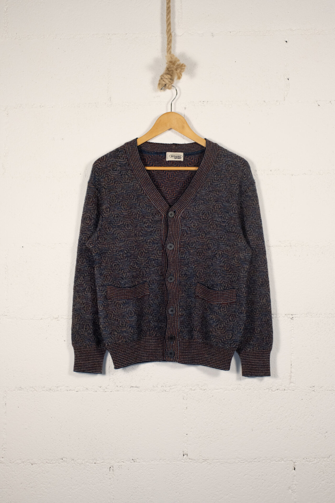 Cardigan Missoni Sport in fantasia iconica multicolore, realizzato in morbido misto lana. Chiusura frontale con bottoni originali logati e due taschini applicati sul davanti. Design vintage, stile casual ed elegante, ideale per la mezza stagione. Capo autentico e ricercato, perfetto per outfit unici e sofisticati. Ottime condizioni.
