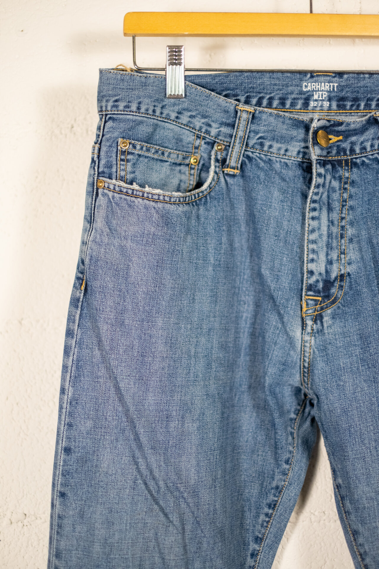 Jeans Carhartt WIP originali in denim azzurro chiaro con lavaggio effetto used e leggere abrasioni frontali.