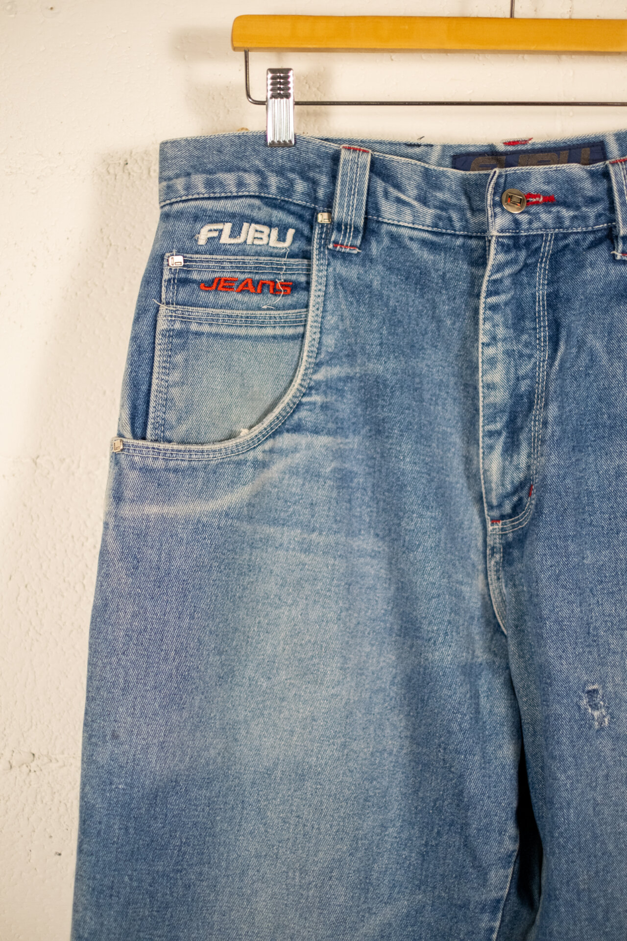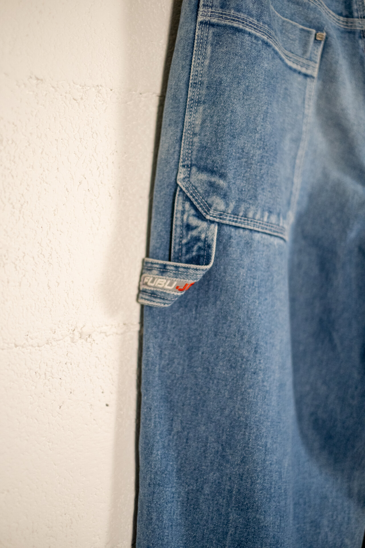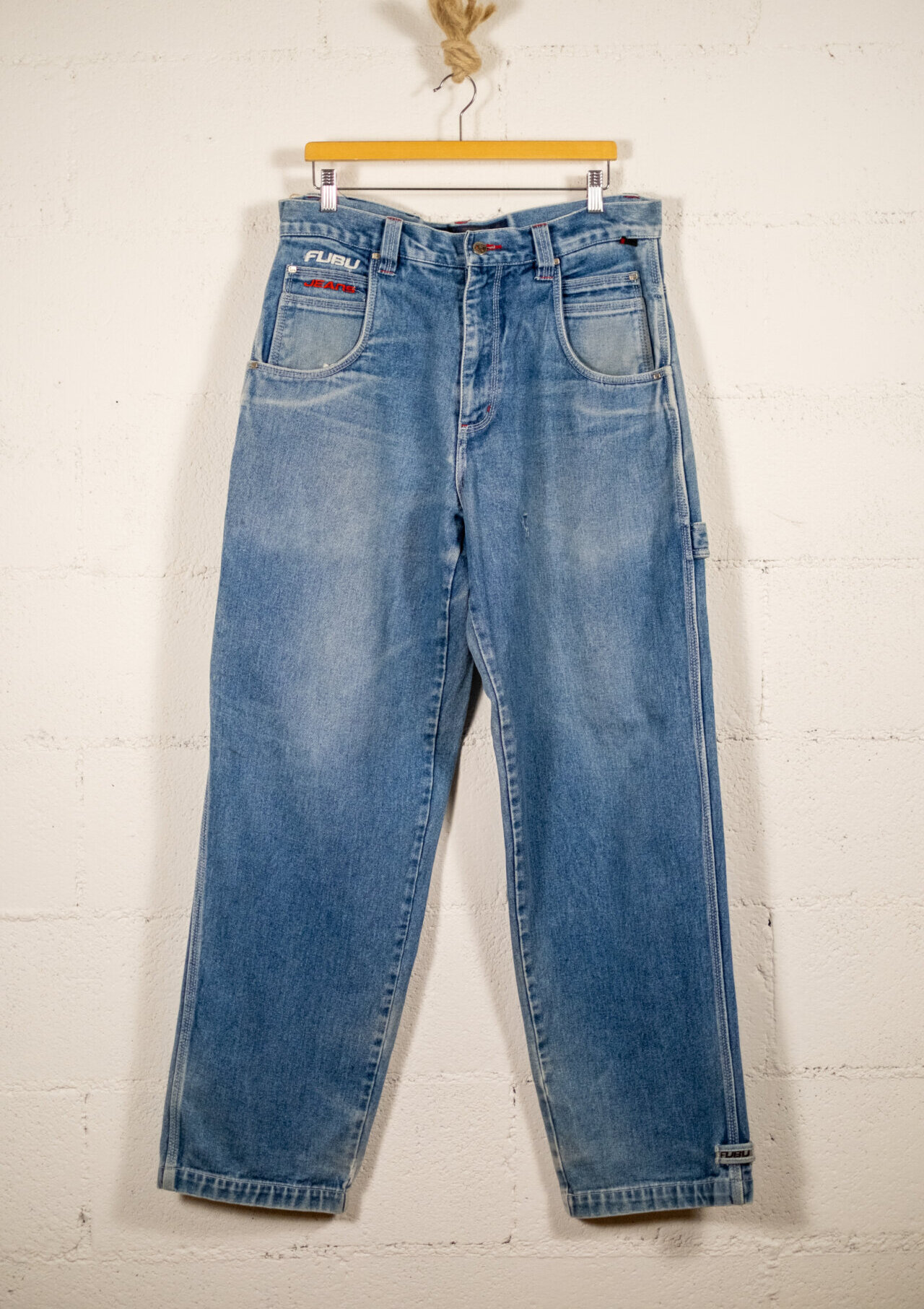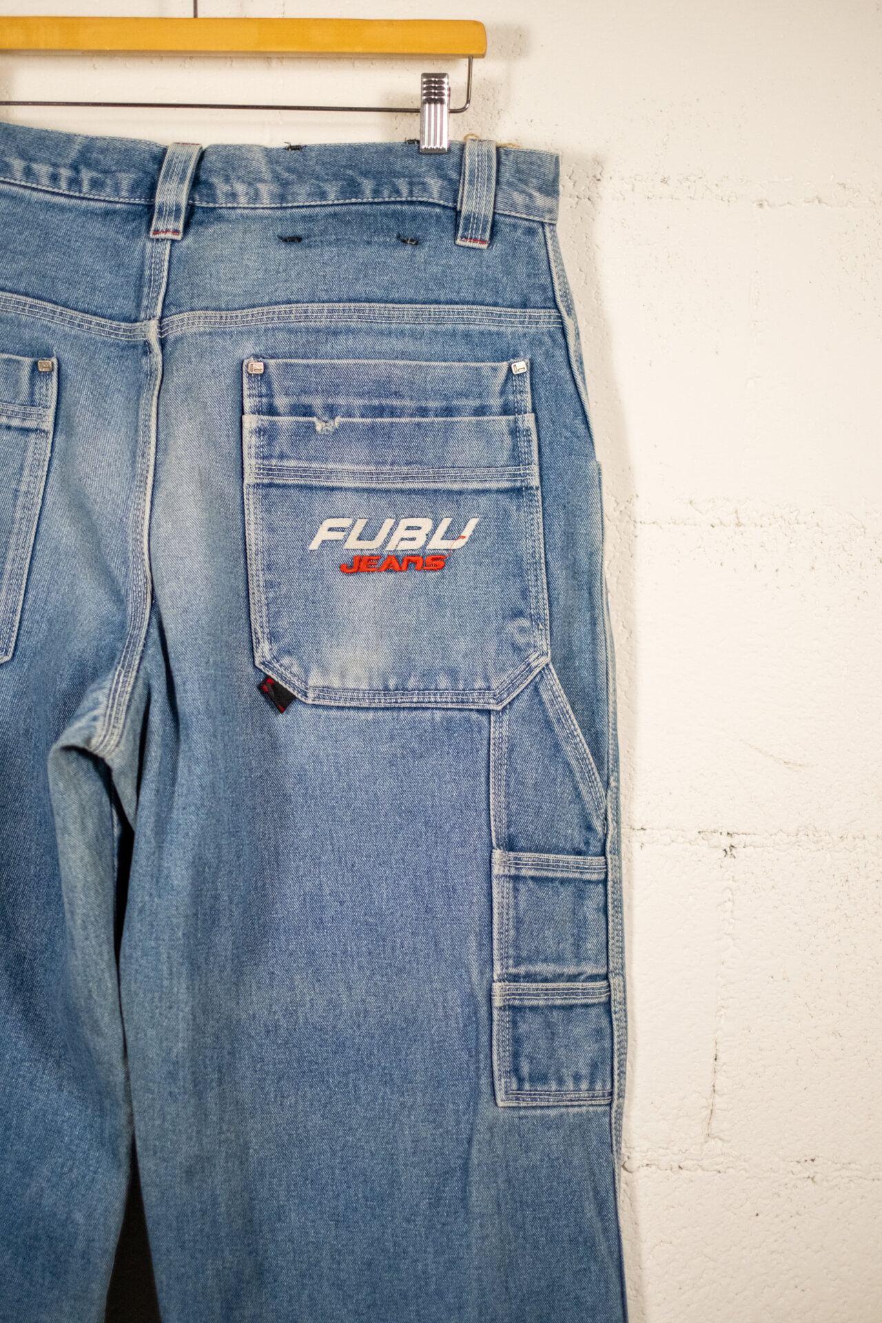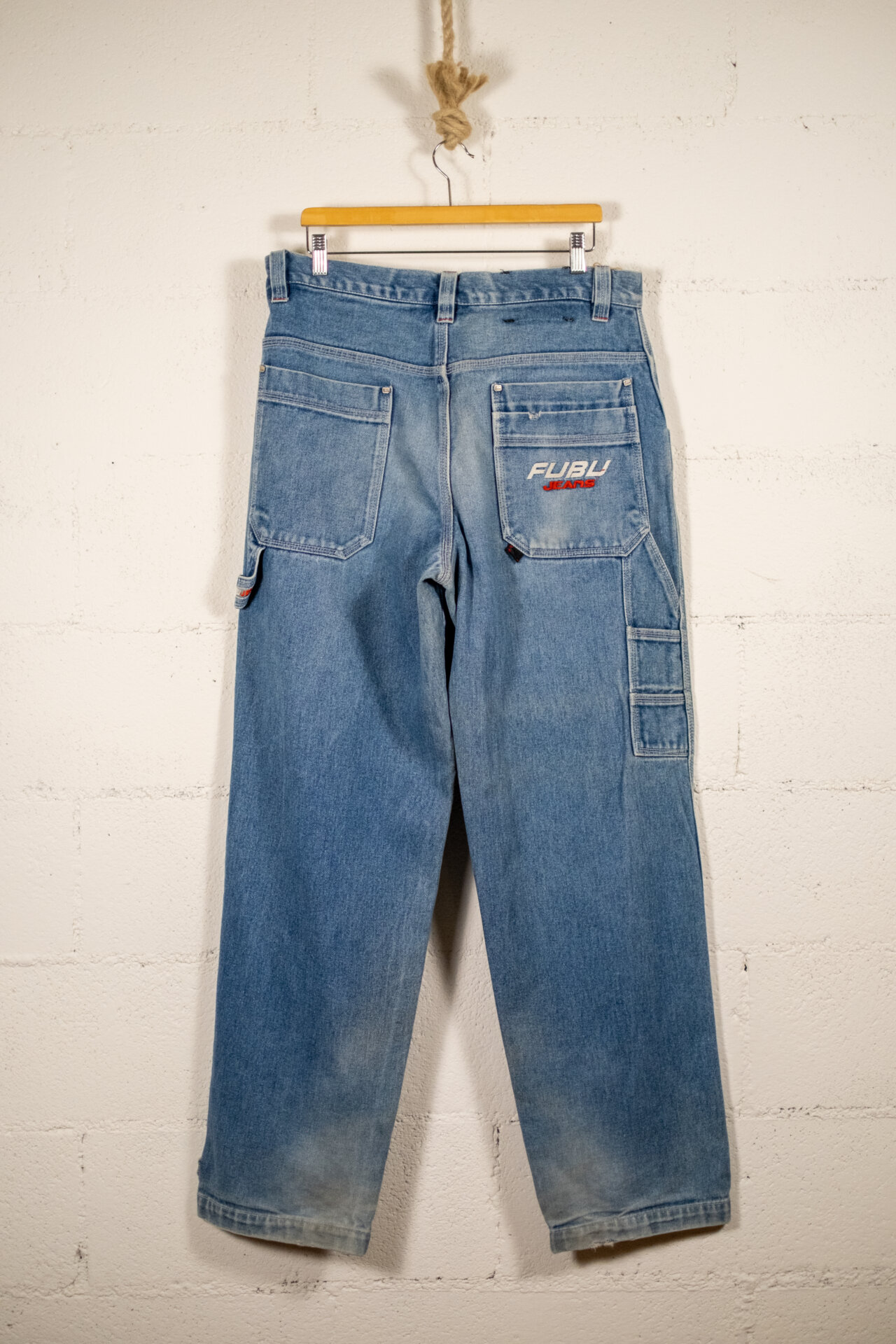 Jeans vintage FUBU in denim lavaggio medio chiaro con dettagli utility.