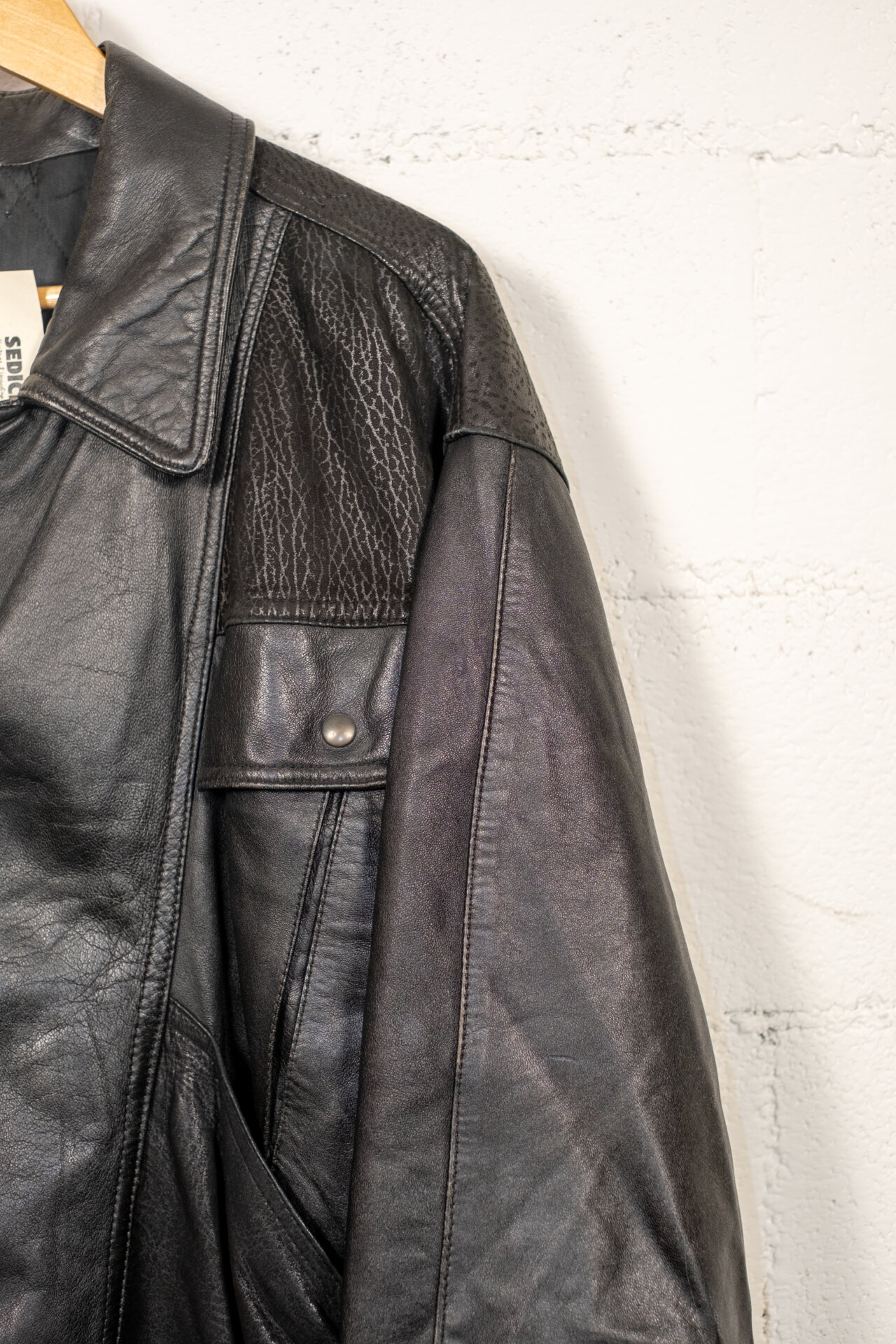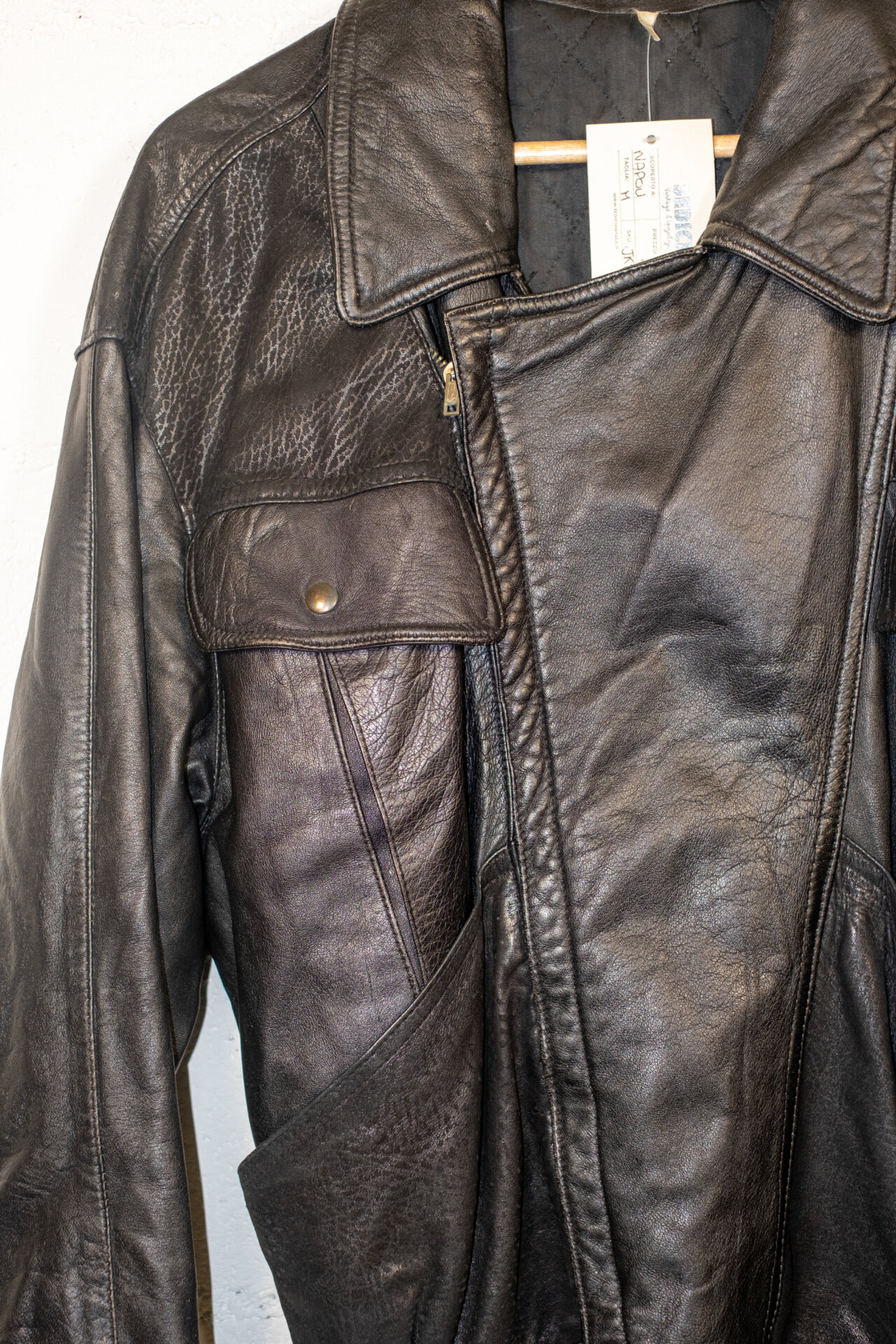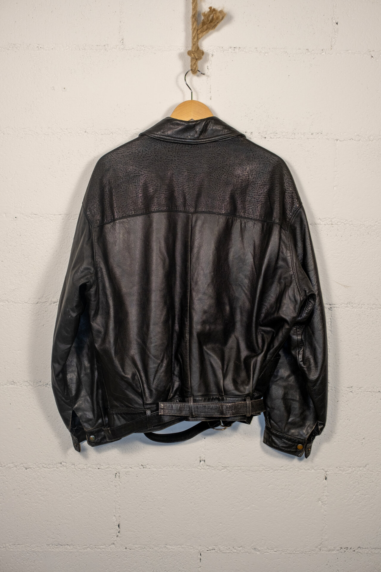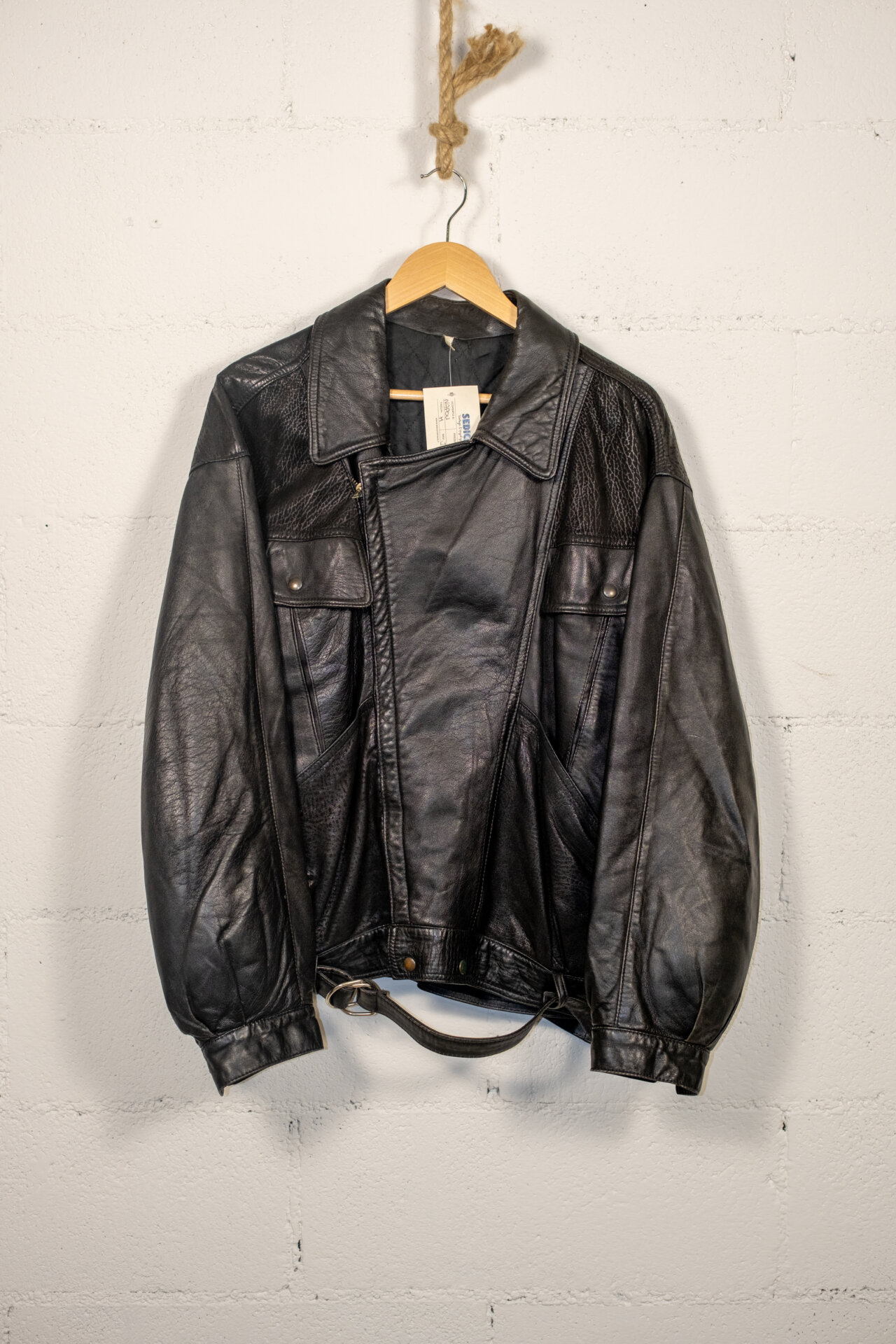 Giacca vintage in vera pelle nera dallo stile biker anni ’80/’90. Caratterizzata da chiusura asimmetrica, cintura regolabile sul fondo, tasche con bottone e pannelli in pelle testurizzata sulle spalle. Vestibilità regolare, pelle morbida con patina naturale che ne esalta il carattere autentico.
