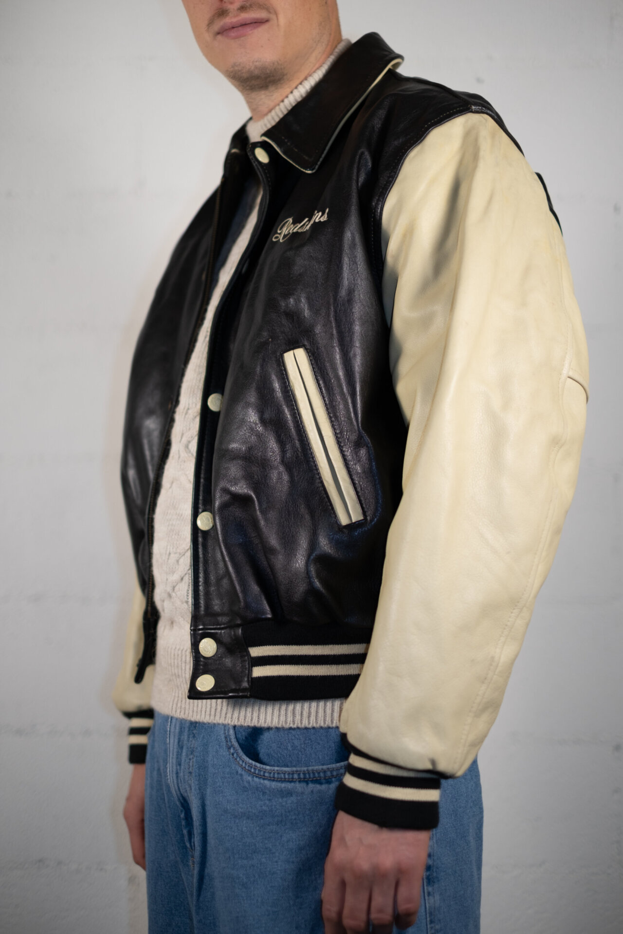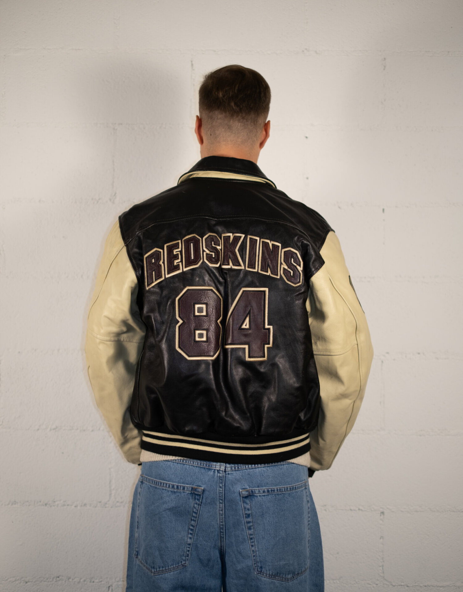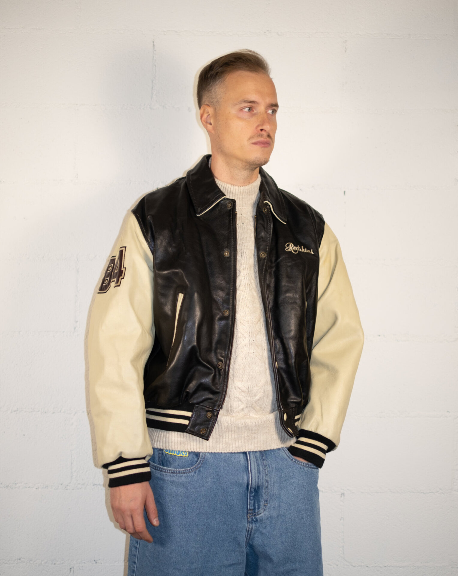 Giacca varsity originale anni ’90 in pelle nera e panna, con ricamo “Redskins” sul petto e patch 84 su manica e retro. Chiusura con bottoni automatici, dettagli a costine su fondo e polsini, interno in materiale sintetico. La pelle è morbida, vissuta e ricca di carattere.