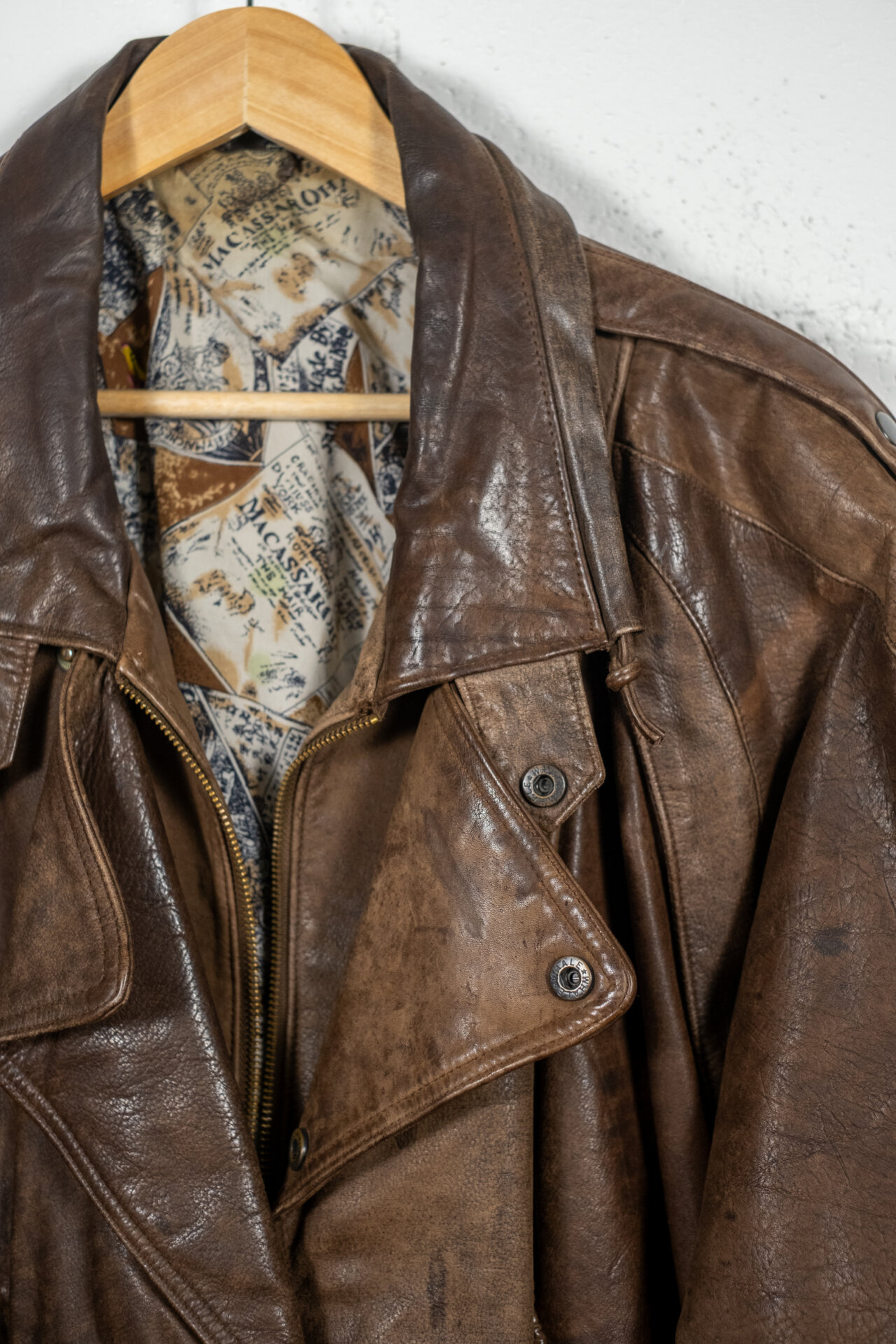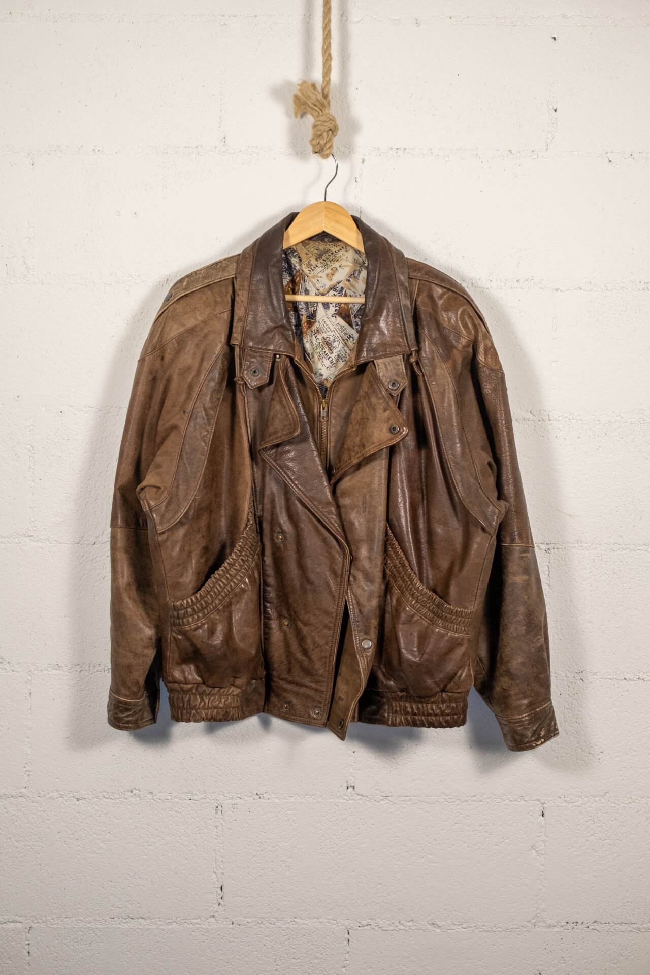 La pelle marrone presenta una patina naturale e sfumature irregolari che raccontano il tempo e l’utilizzo, rendendo ogni segno parte dell’estetica del capo. Interno foderato con fantasia grafica originale.