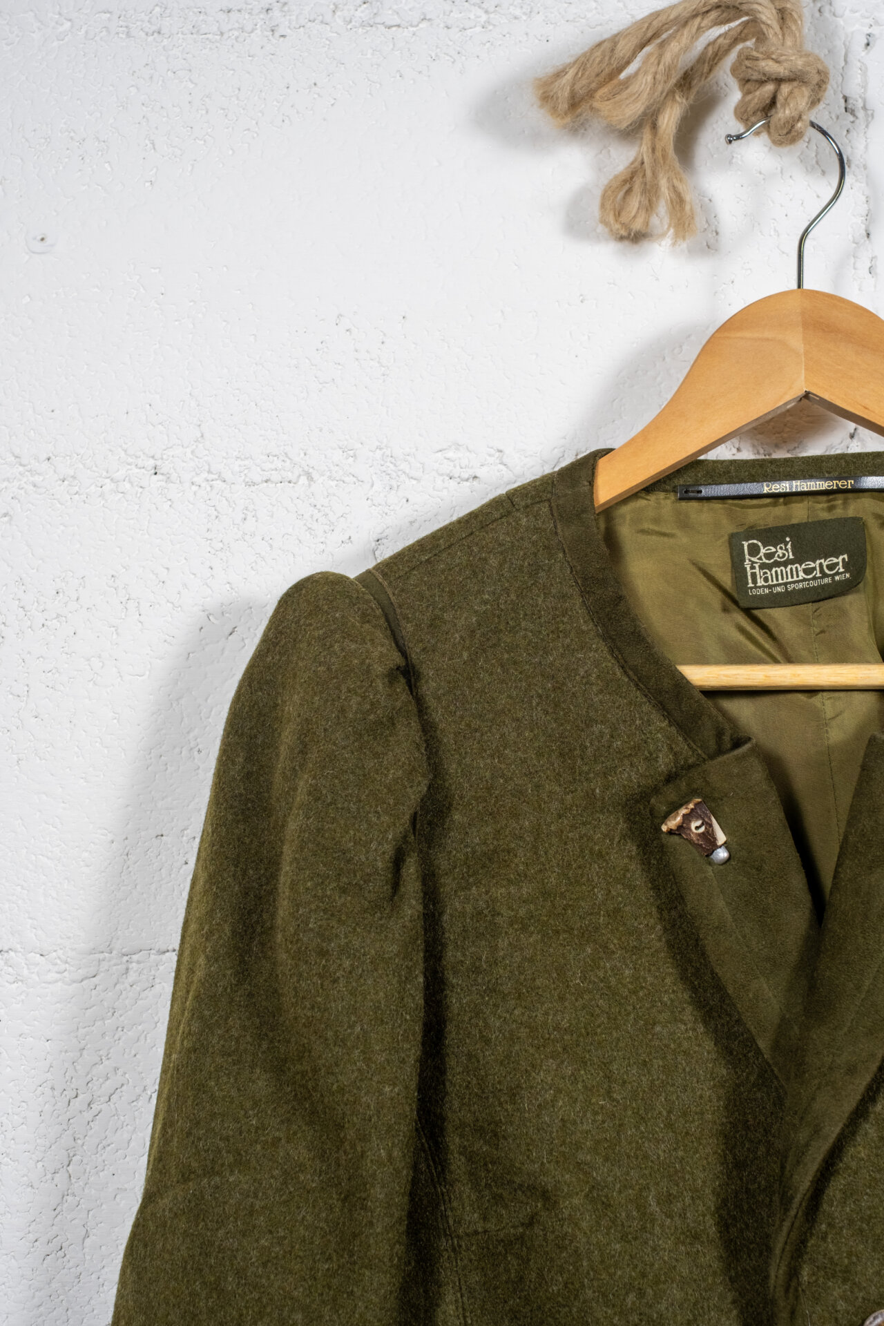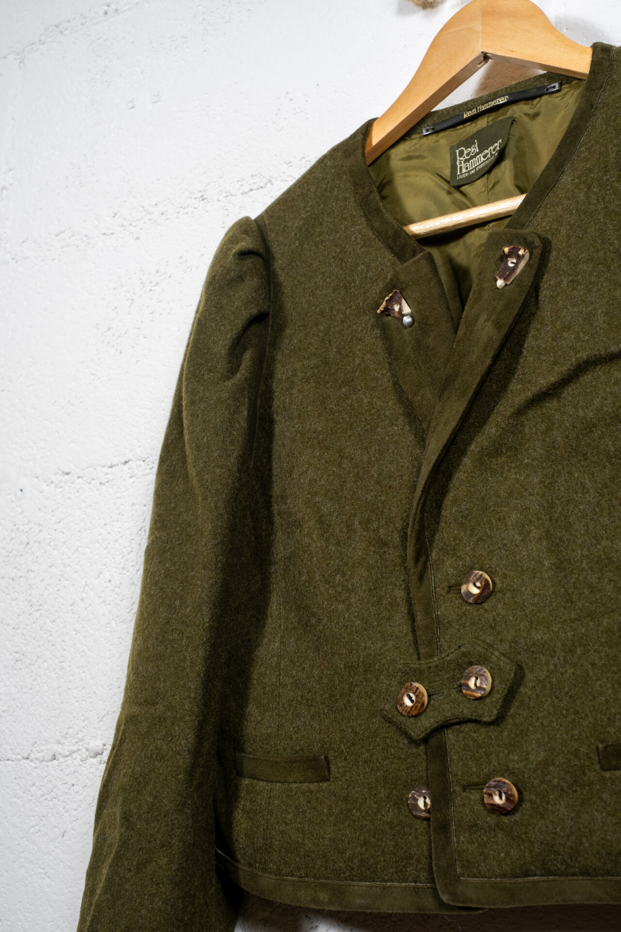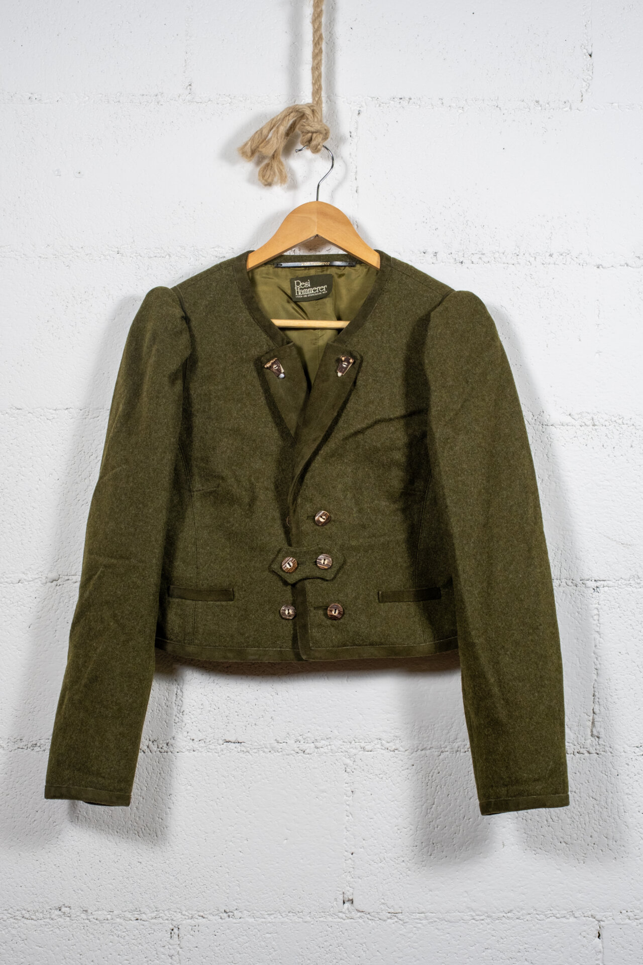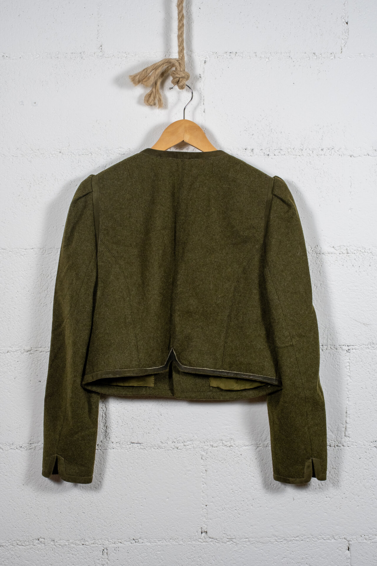 Giacca tirolese corta da donna realizzata in loden di lana, nel classico colore verde oliva. Modello strutturato con spalle leggermente definite, chiusura frontale asimmetrica con bottoni decorativi e dettagli tradizionali alpini. Linea cropped sul retro che valorizza la silhouette, perfetta sia in chiave heritage che contemporanea. Un capo di qualità, caldo e resistente, ideale per look vintage, folk o sartoriali.