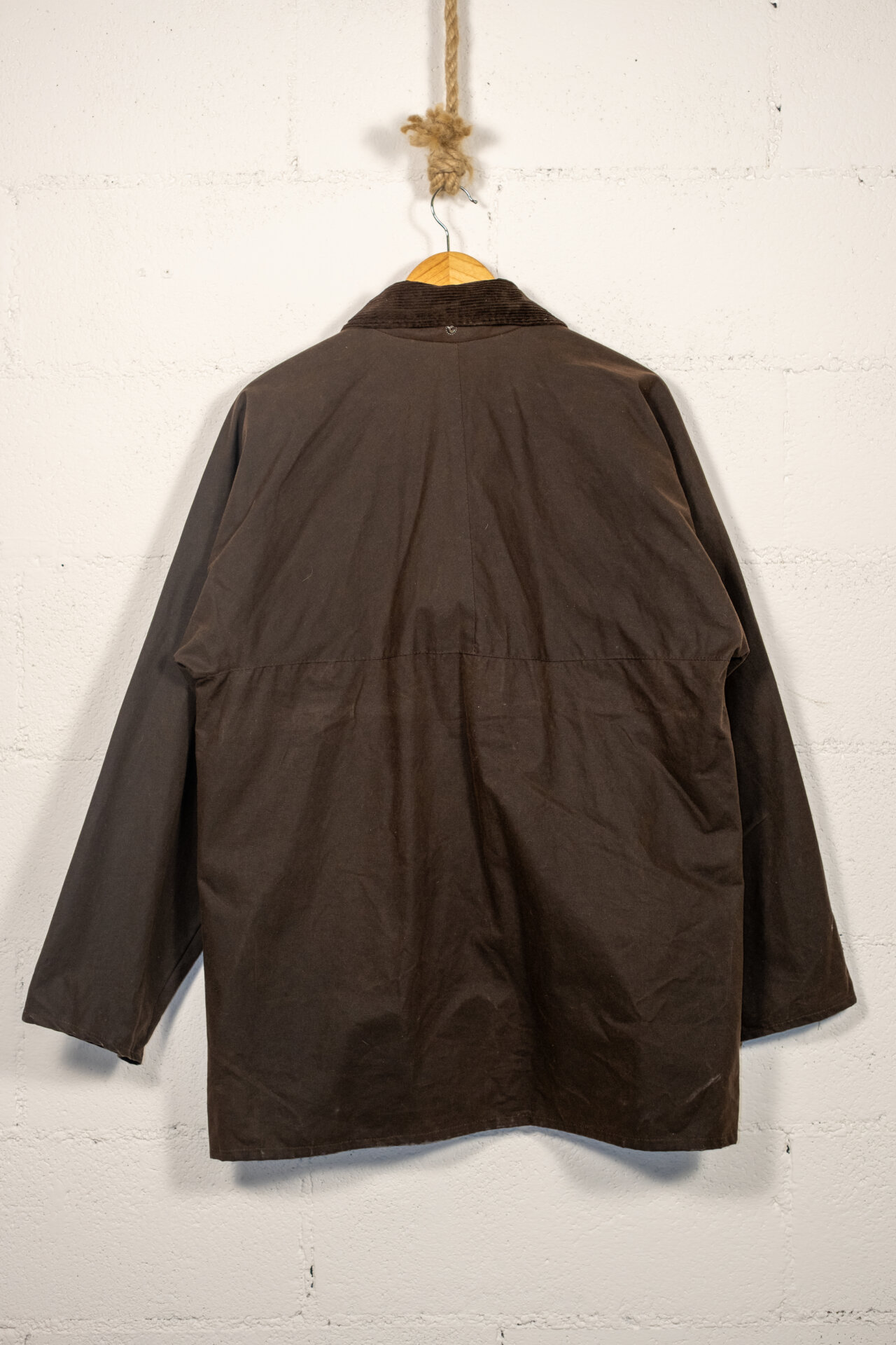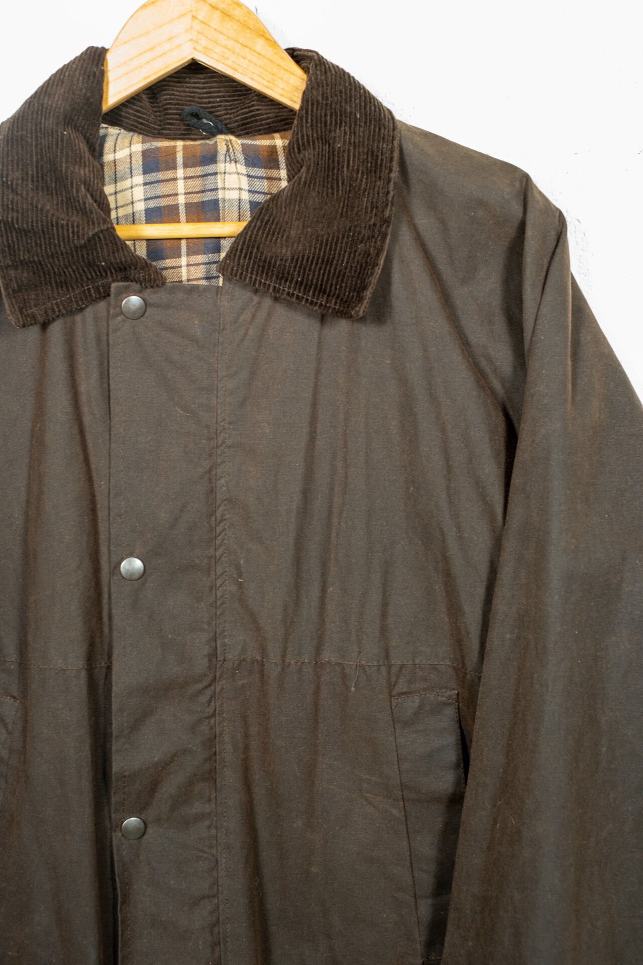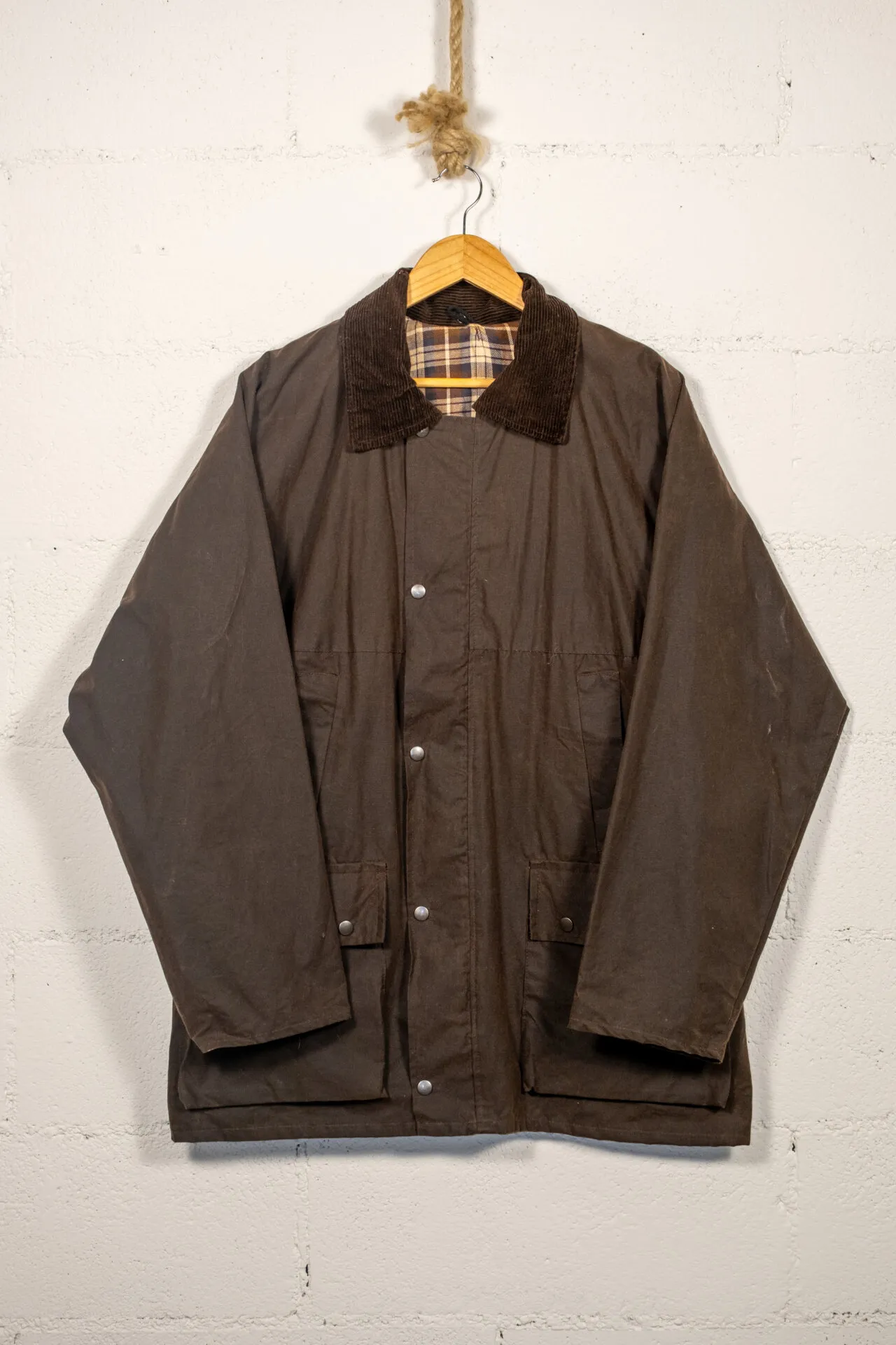 Giacca vintage in cotone cerato marrone d’ispirazione heritage e country. Dotata di colletto in velluto a coste, chiusura frontale a bottoni automatici, tasche applicate e fodera interna tartan. Vestibilità regolare, tessuto resistente e look workwear / outdoor senza tempo.