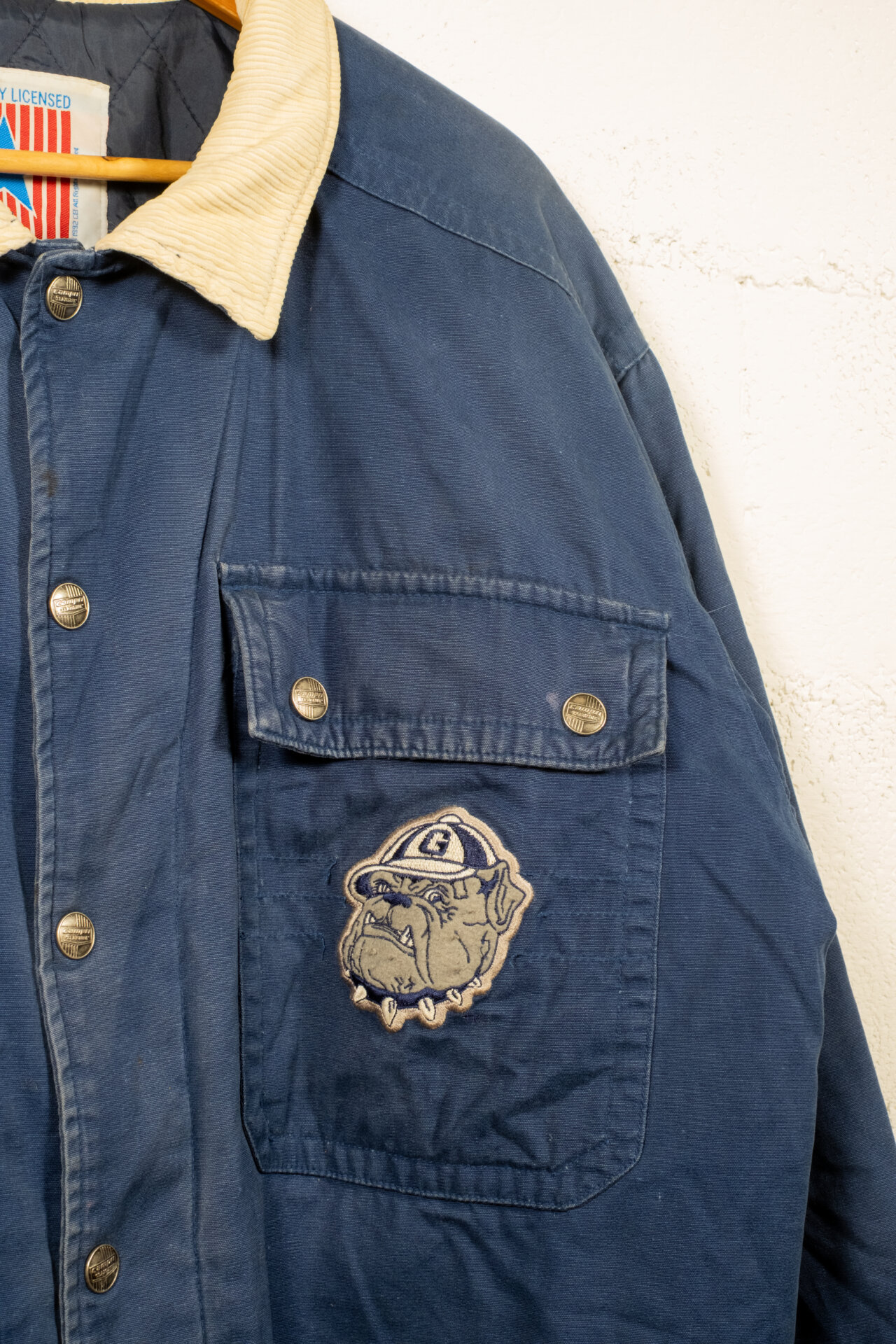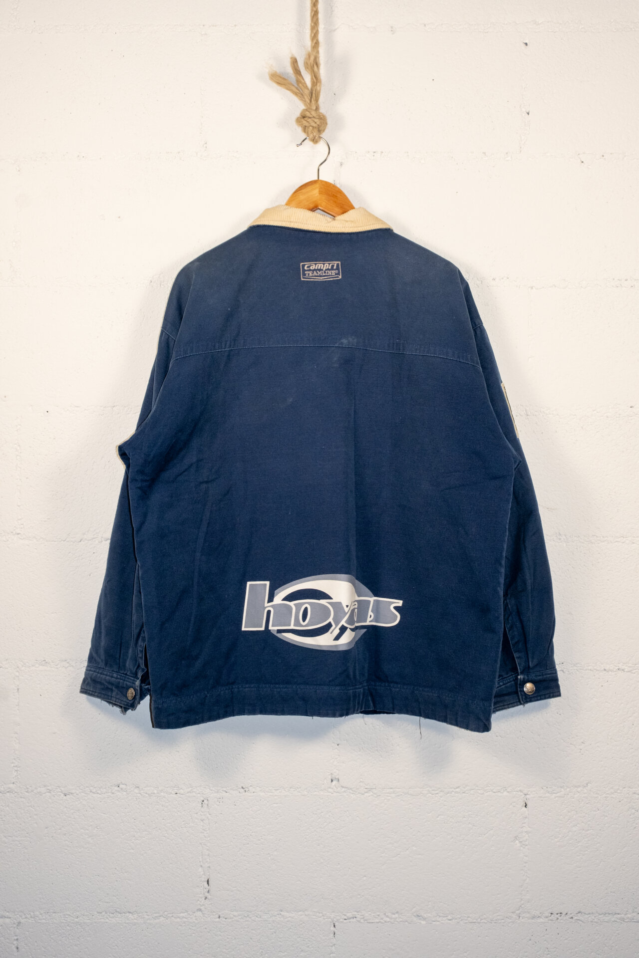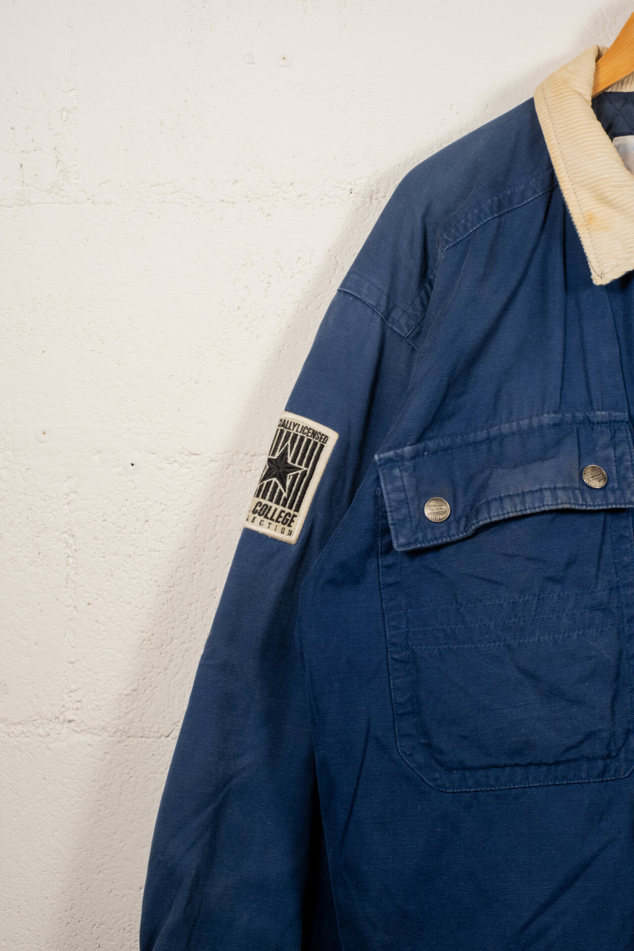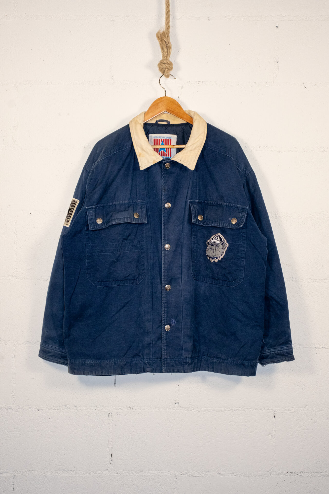Giacca vintage in cotone resistente dal taglio workwear, caratterizzata da colletto in velluto a contrasto e chiusura frontale con bottoni metallici. Il design presenta tasche frontali con patta e bottoni, oltre a patch ricamate applicate sul petto e sulla manica che donano personalità e richiamo heritage.