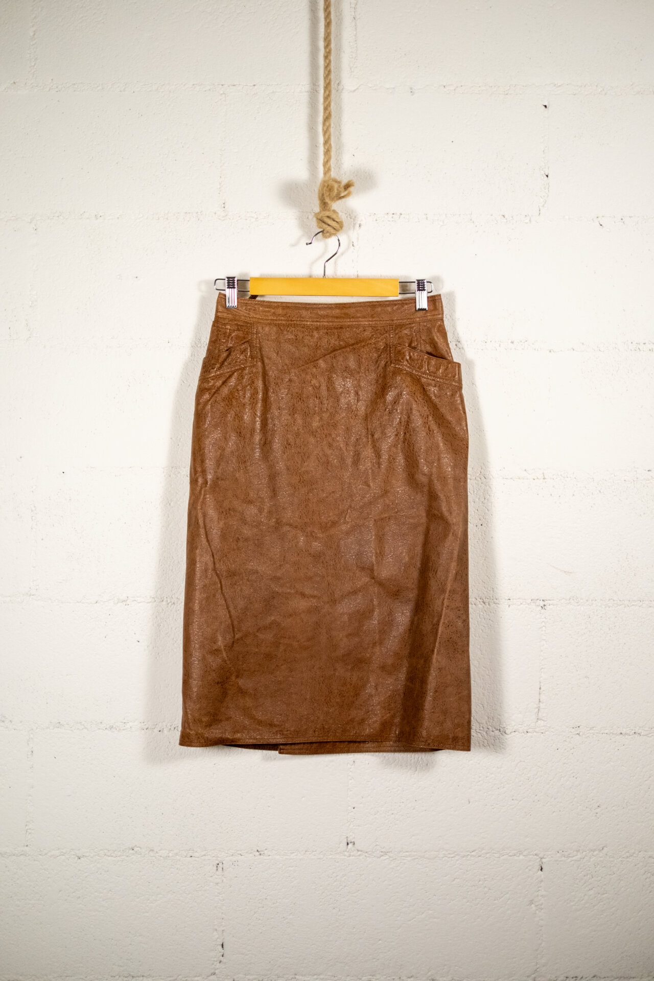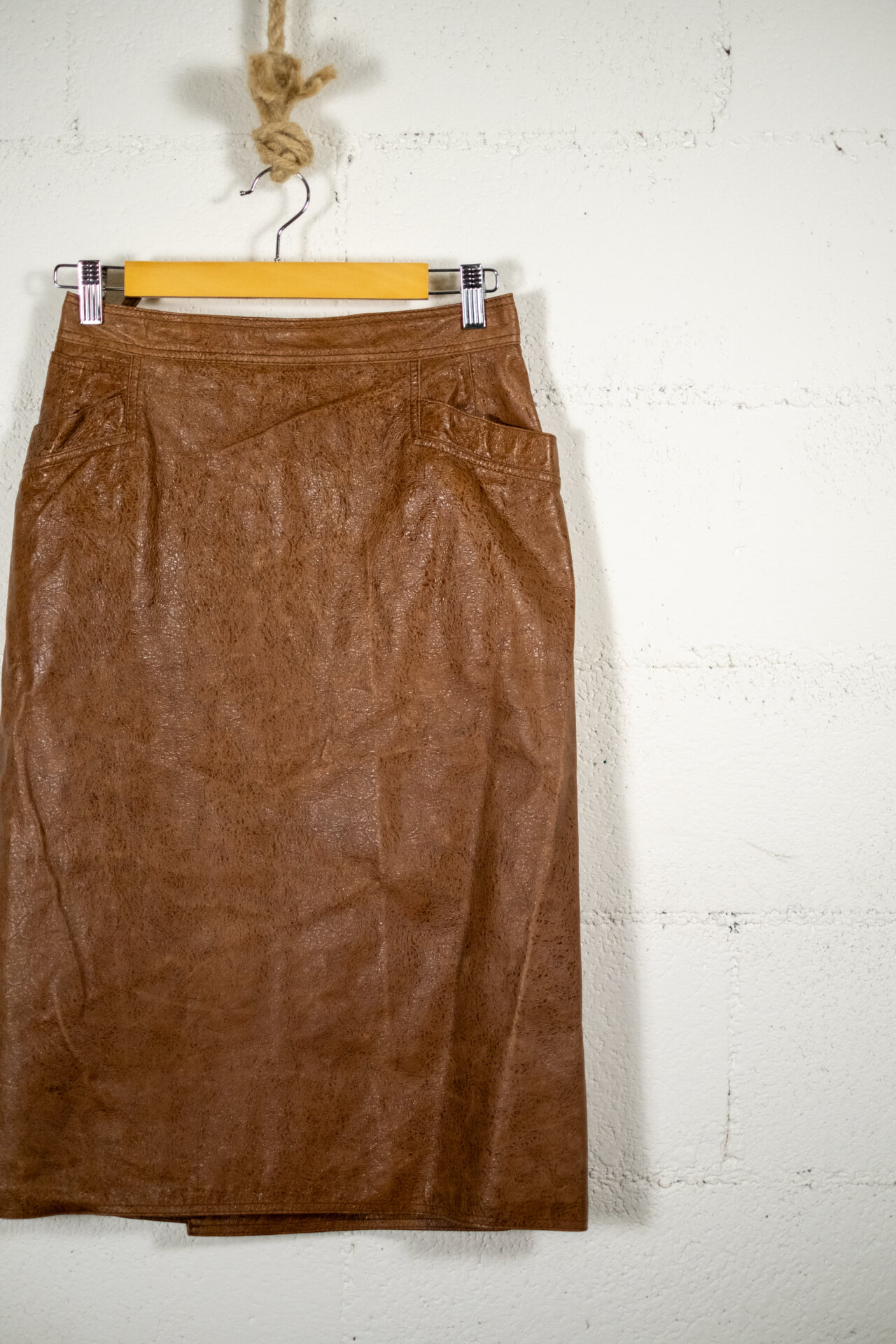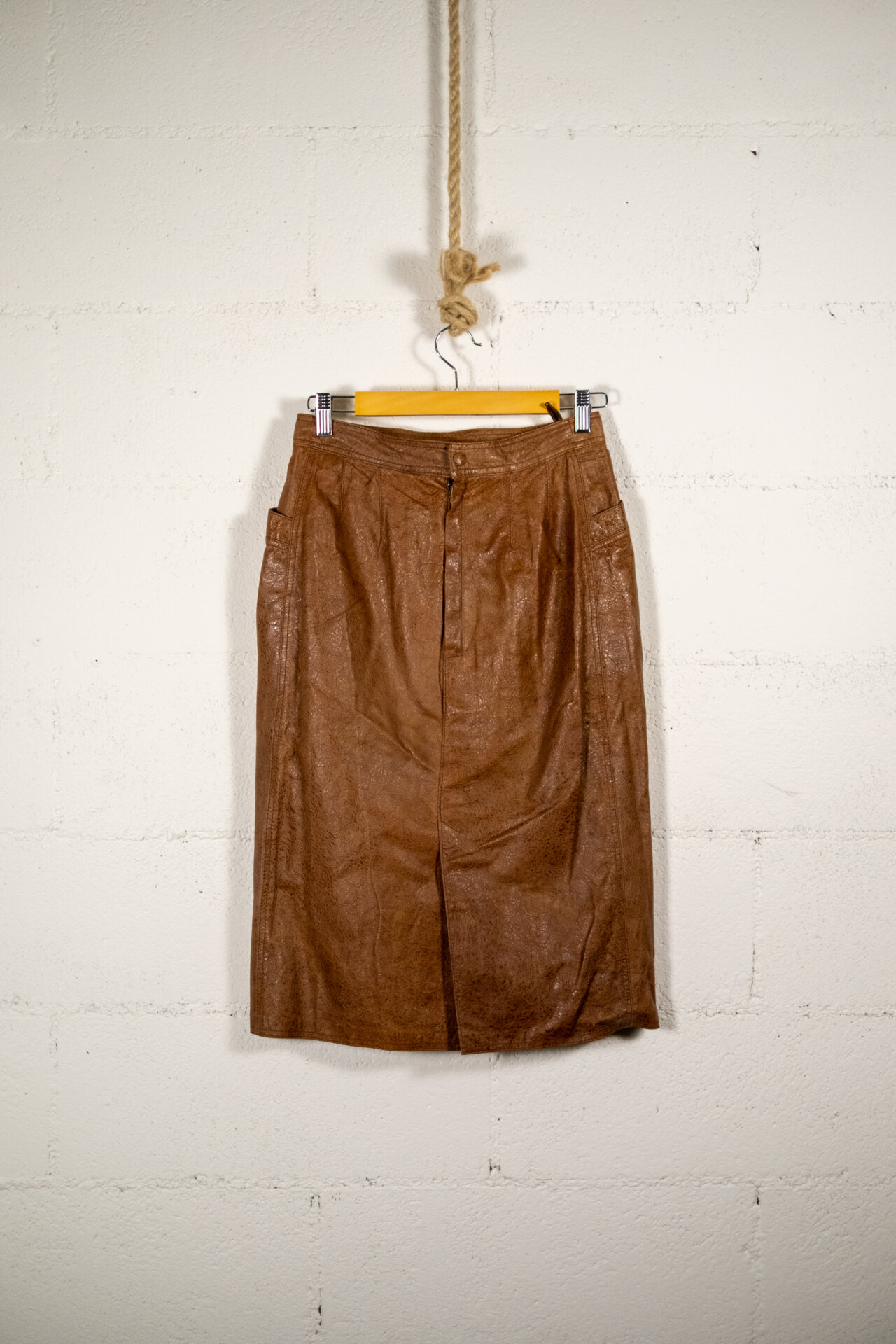 Gonna vintage donna in pelle marrone con texture naturale vissuta che valorizza l’autenticità del capo. Modello midi a vita alta con linea dritta e costruzione strutturata.