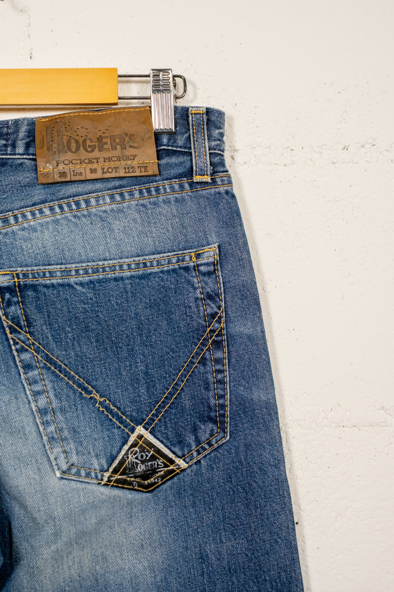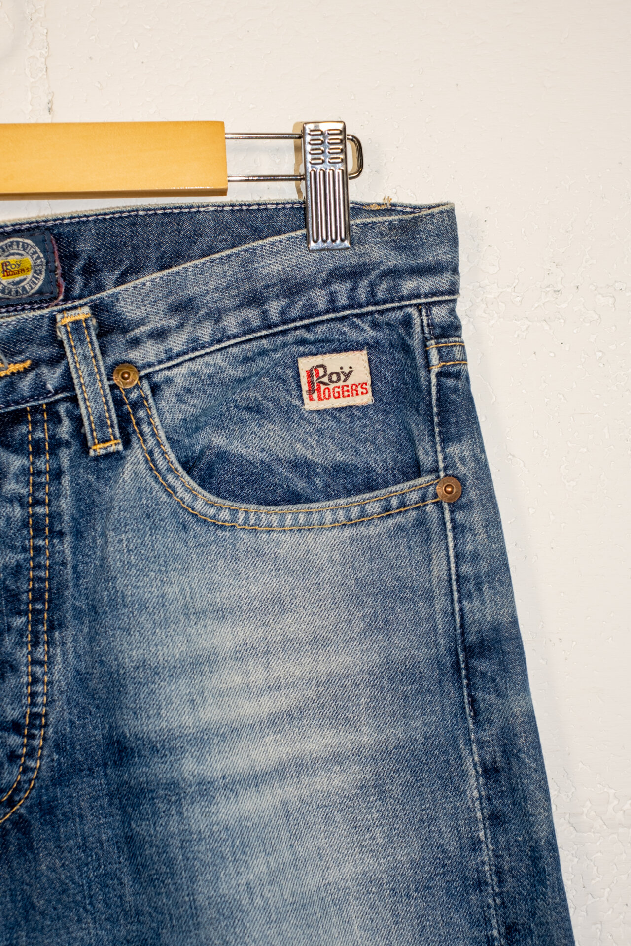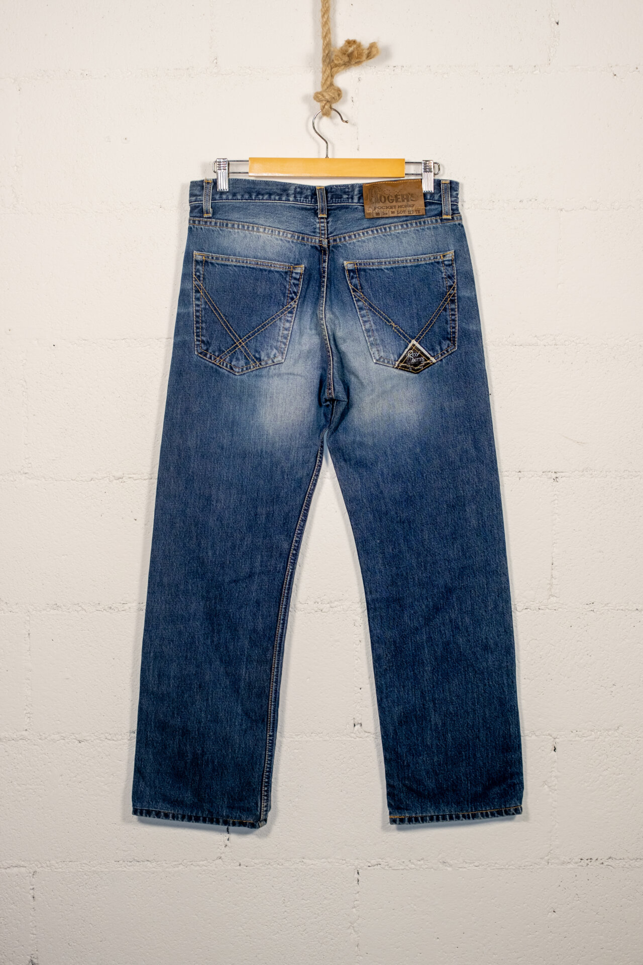 Jeans vintage Roy Roger’s in denim blu con lavaggio vissuto, caratterizzati da una linea dritta e da una vestibilità classica, autentica e senza tempo. Realizzati in cotone resistente, presentano chiusura con zip e bottone, cinque tasche, cuciture a contrasto e patch logo posteriore, elementi iconici del denim d’epoca.