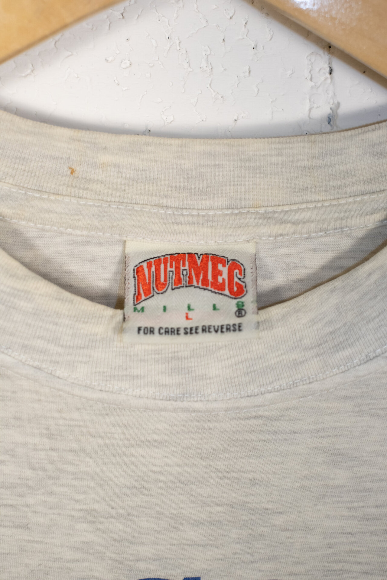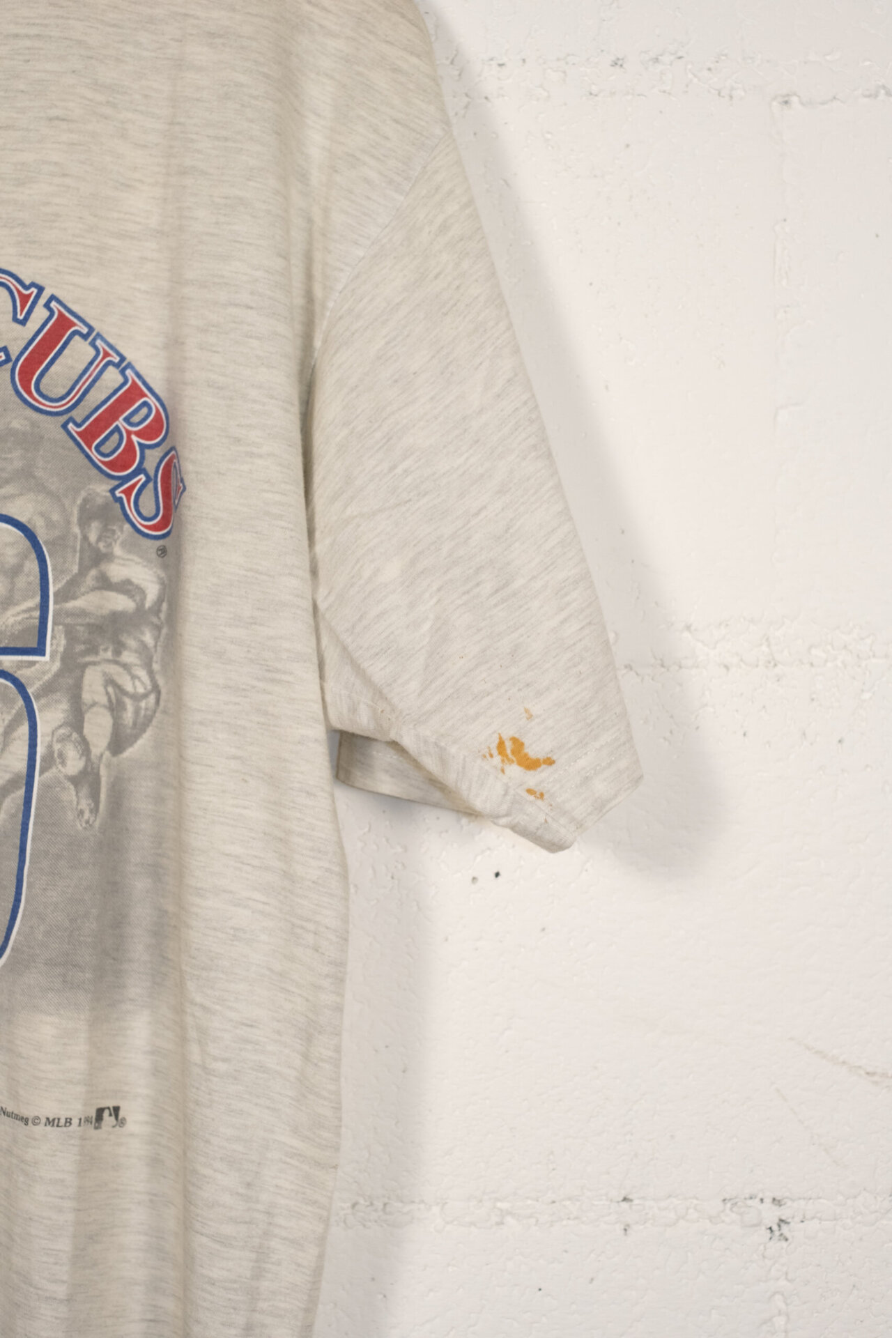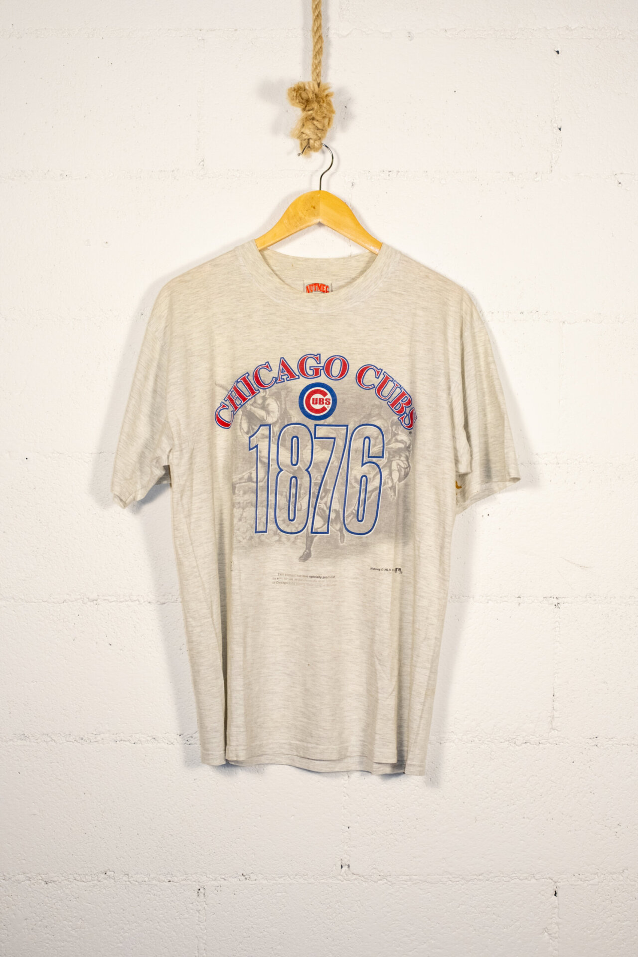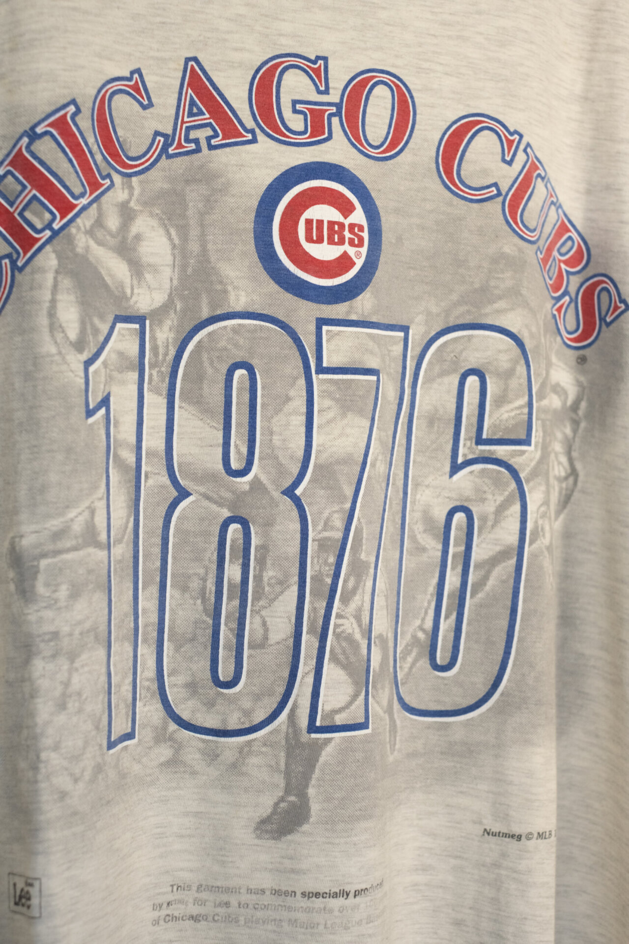 Realizzata in morbido cotone grigio melange, la maglietta presenta la grafica frontale “Chicago Cubs 1876” e una stampa sbiadita in stile fotografico sullo sfondo, che conferisce un’estetica autentica e vissuta. Il tag interno Nutmeg Mills e la partnership con Lee ne certificano l’originalità.