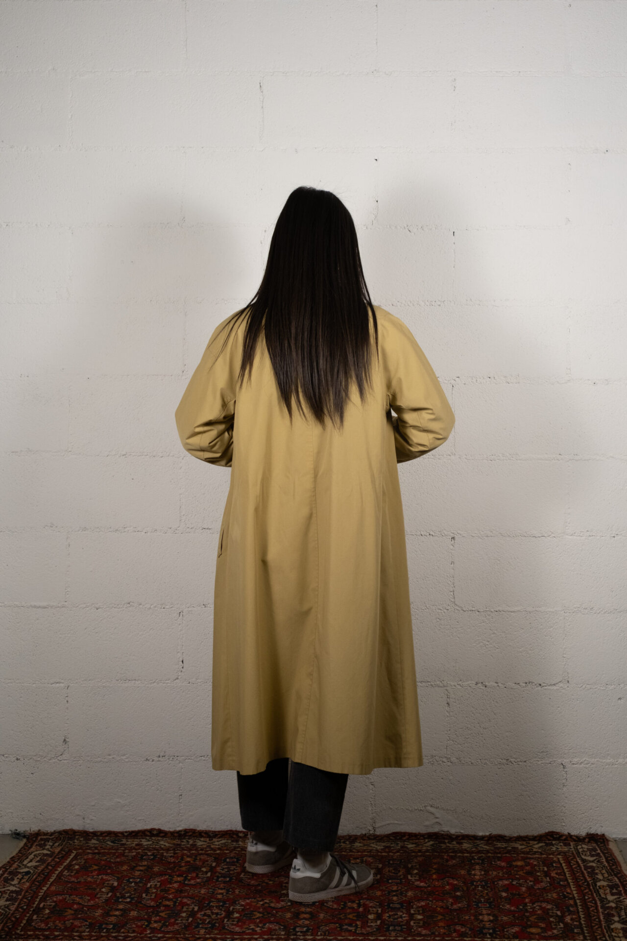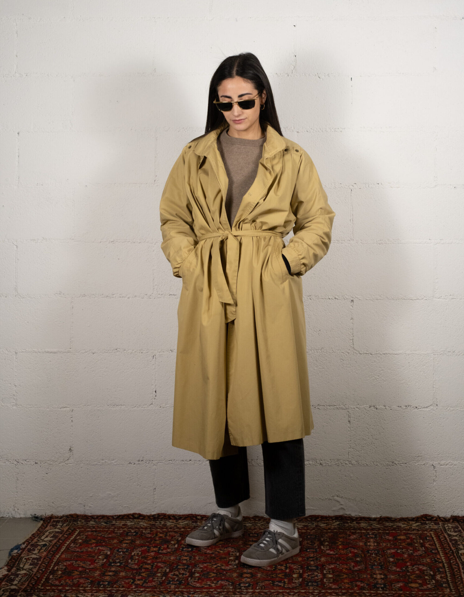 Taglio ad A che dona una vestibilità comoda, presenta due tasche laterali ed abbottonatura frontale. Dettagli borchiati sulle spalle che creano un effetto arricciato. Provvisto di cintura.