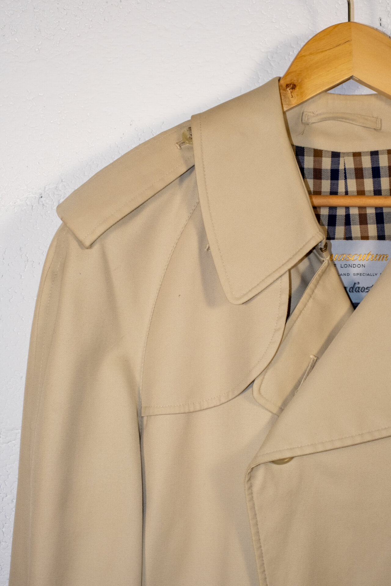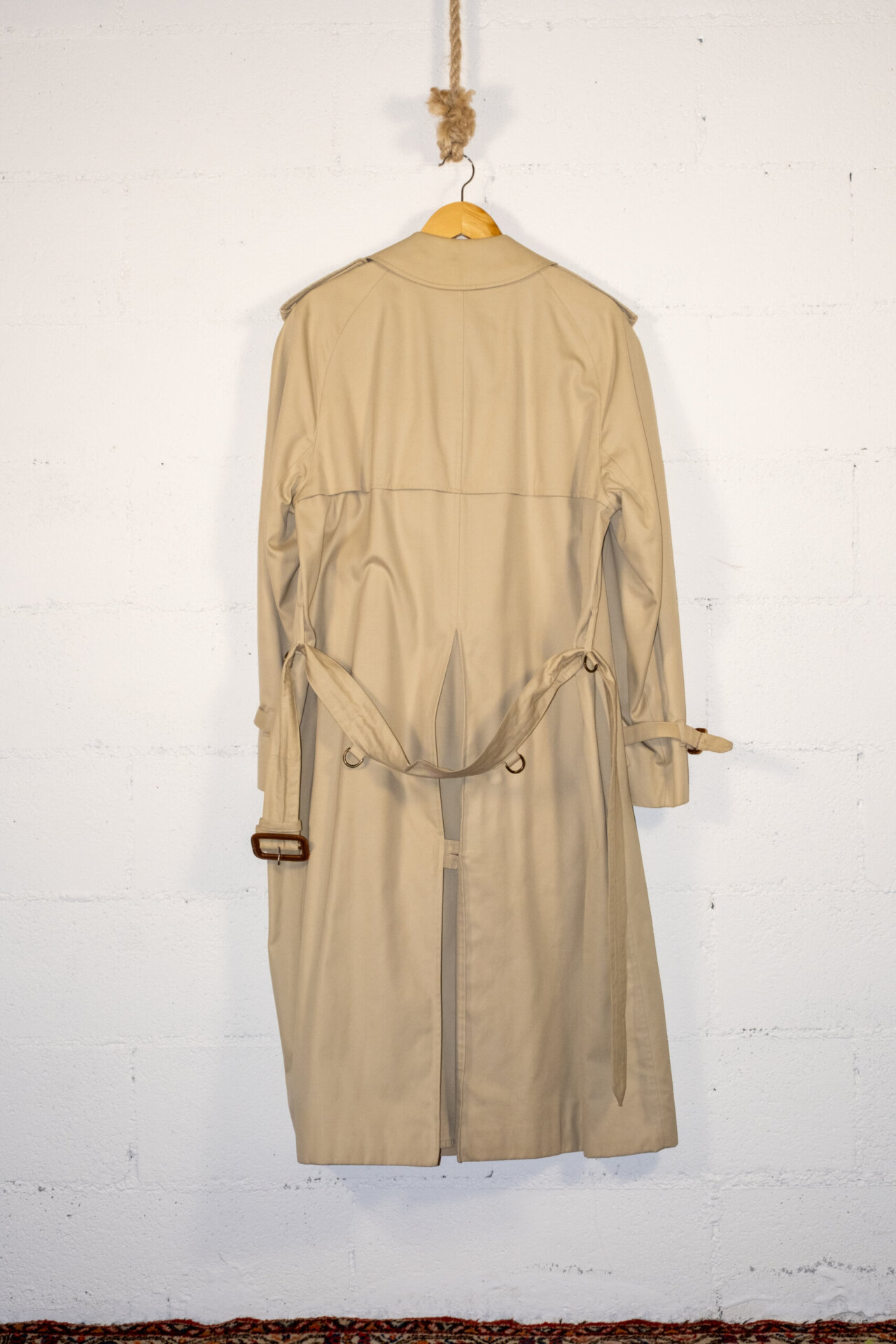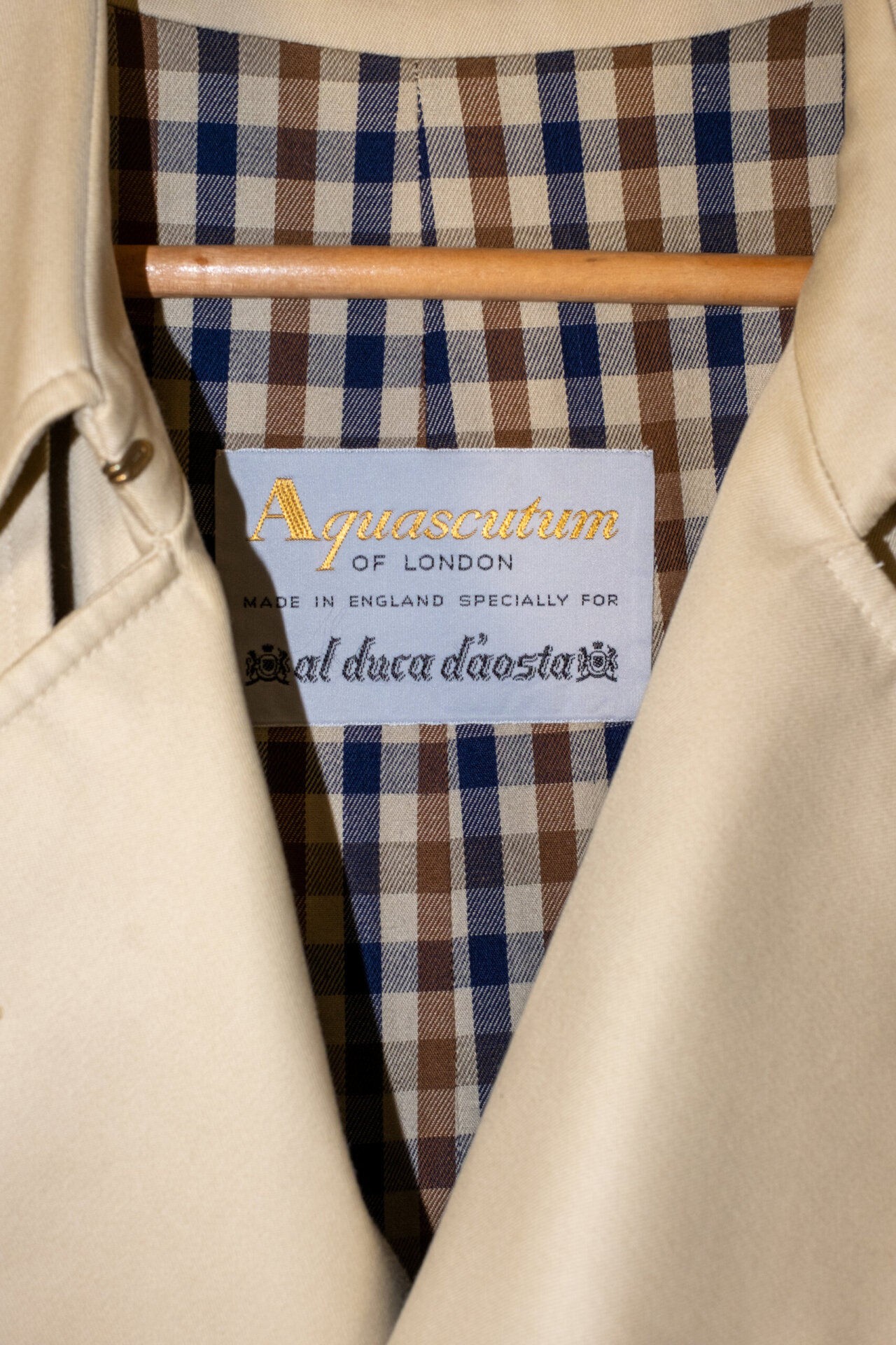 Iconico trench beige doppiopetto firmato Aquascutum of London, realizzato in Inghilterra in esclusiva per “Al Duca d’Aosta”. In cotone tecnico con finitura Aqua 5 idrorepellente, interno con fodera a quadri, cintura in vita e polsini regolabili. Un capo classico e intramontabile dell’eleganza britannica.