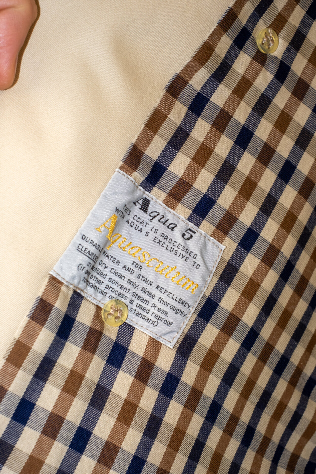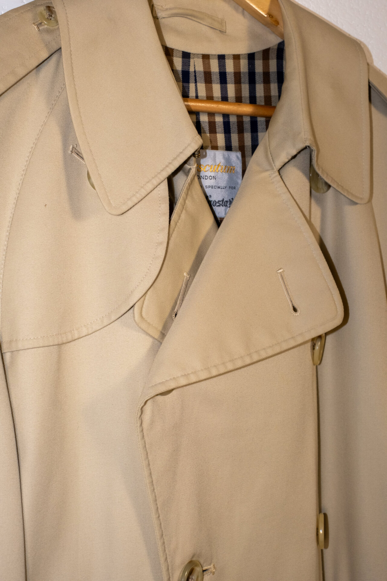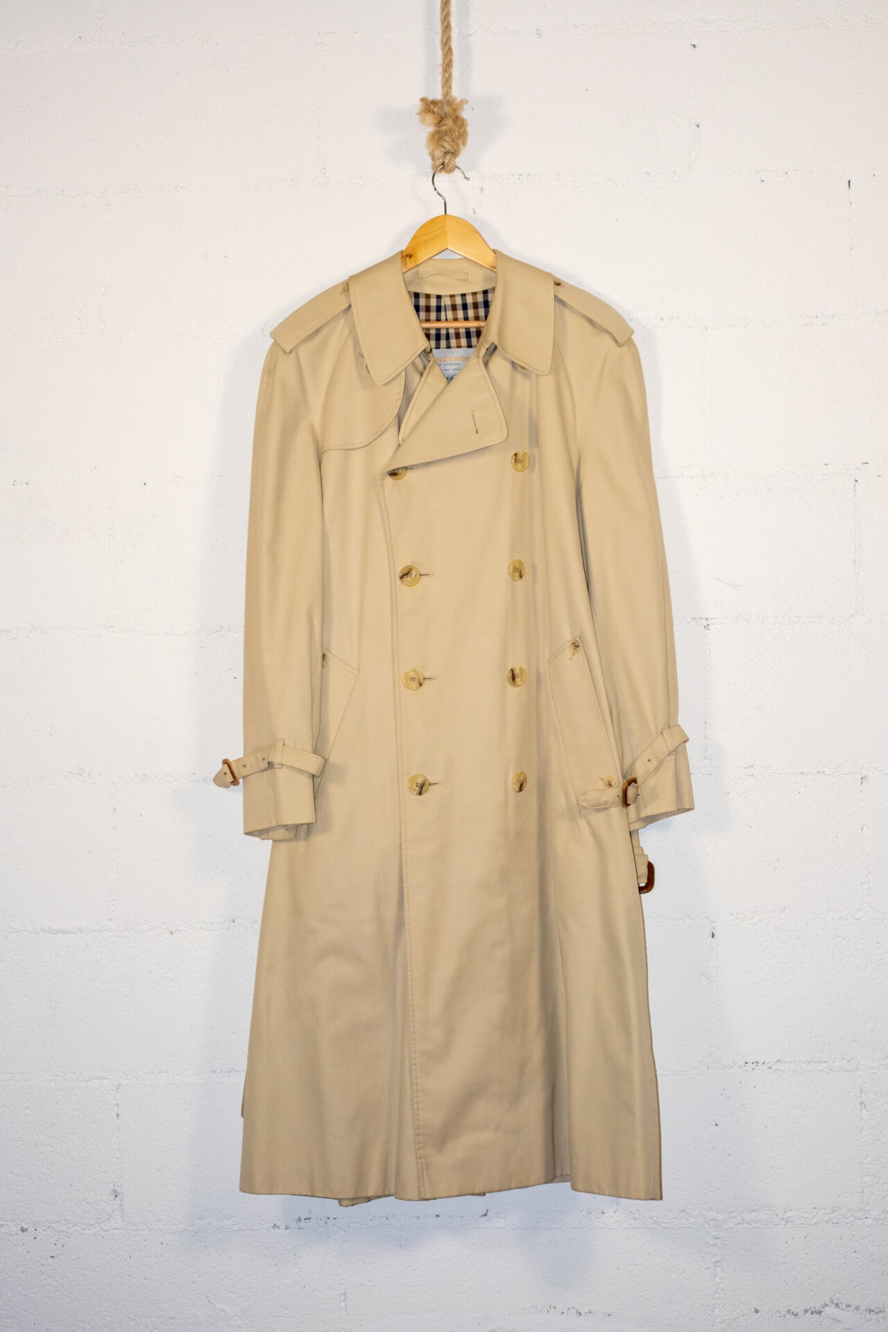 Iconico trench beige doppiopetto firmato Aquascutum of London, realizzato in Inghilterra in esclusiva per “Al Duca d’Aosta”. In cotone tecnico con finitura Aqua 5 idrorepellente, interno con fodera a quadri, cintura in vita e polsini regolabili. Un capo classico e intramontabile dell’eleganza britannica.