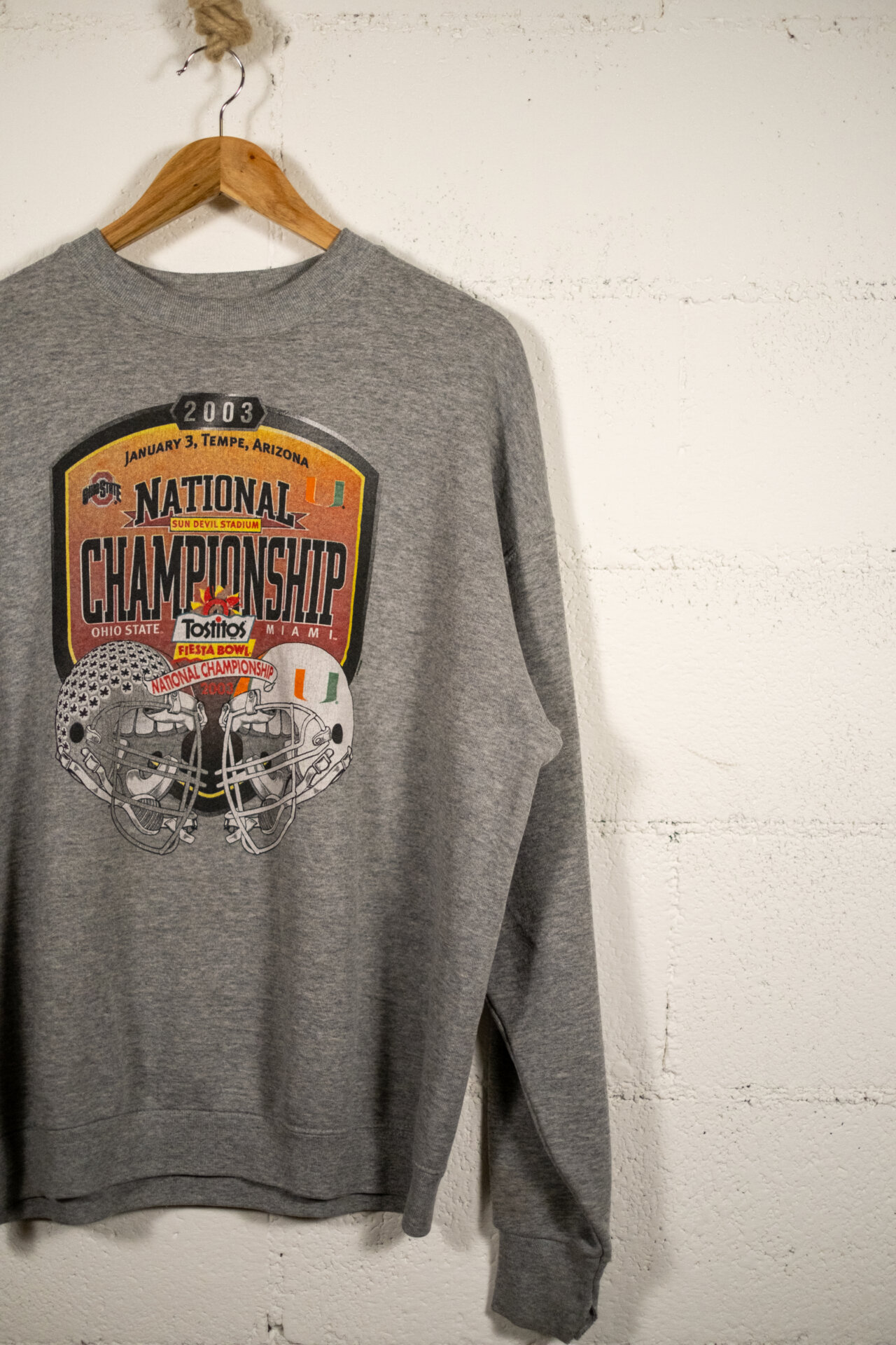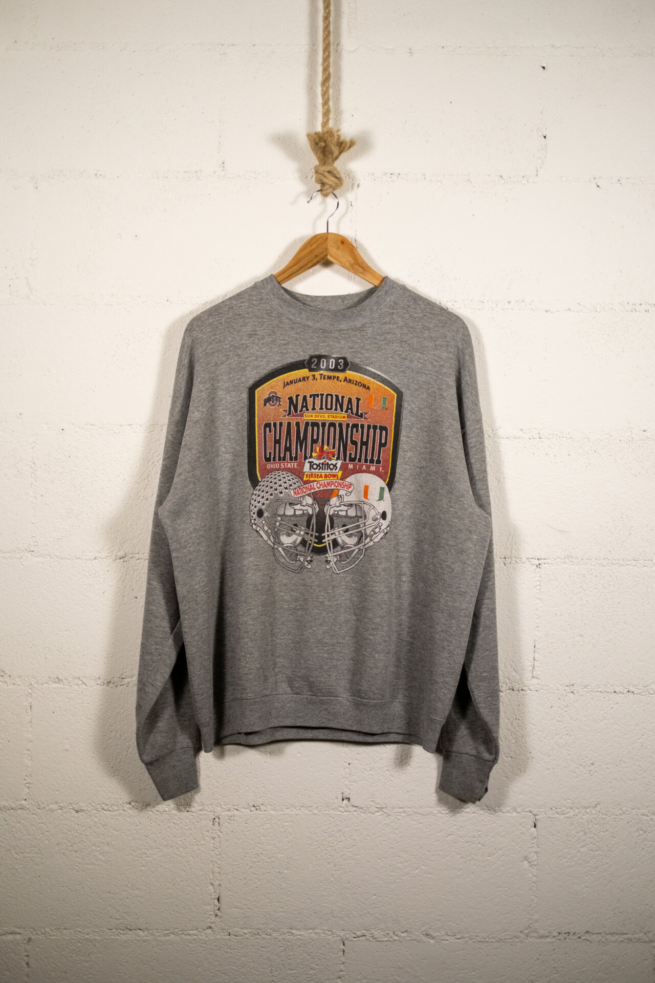 Felpa vintage grigio melange con maxi grafica frontale “National Championship 2003”, ispirata al college football americano.